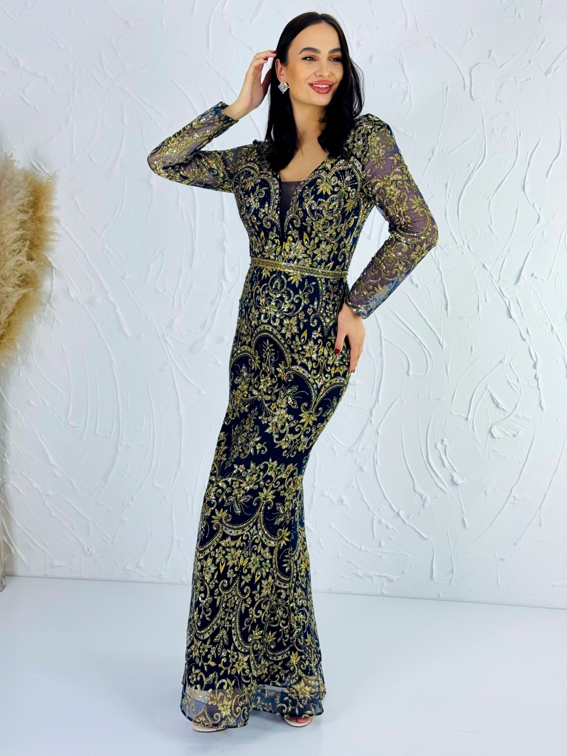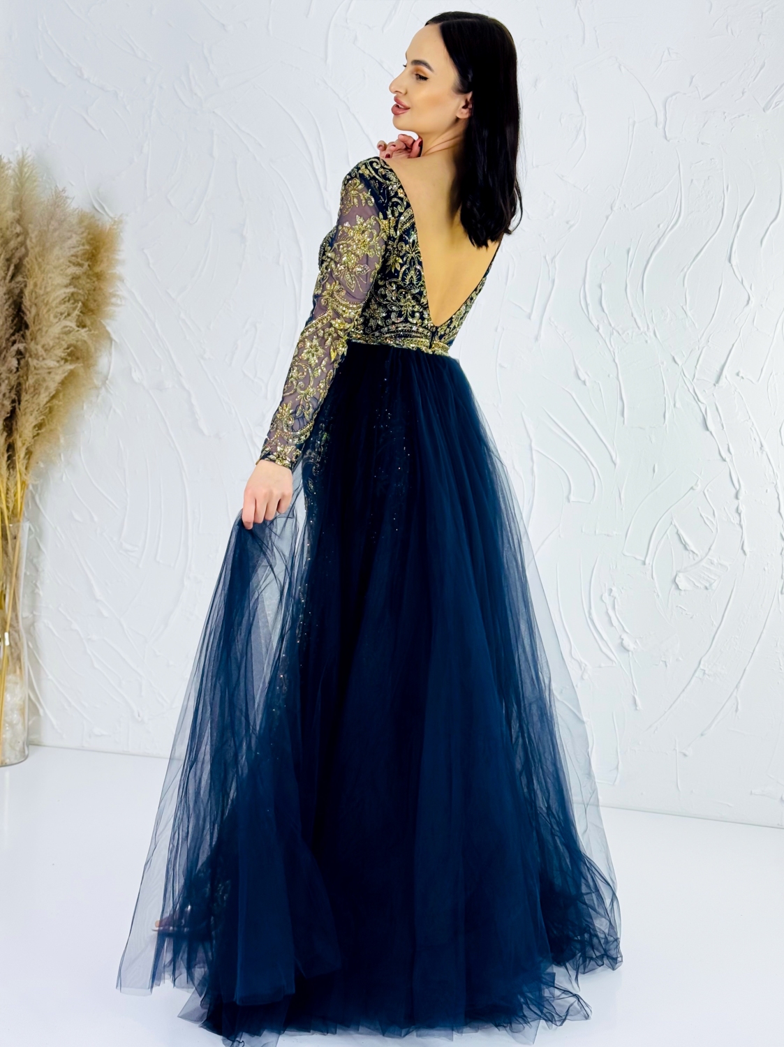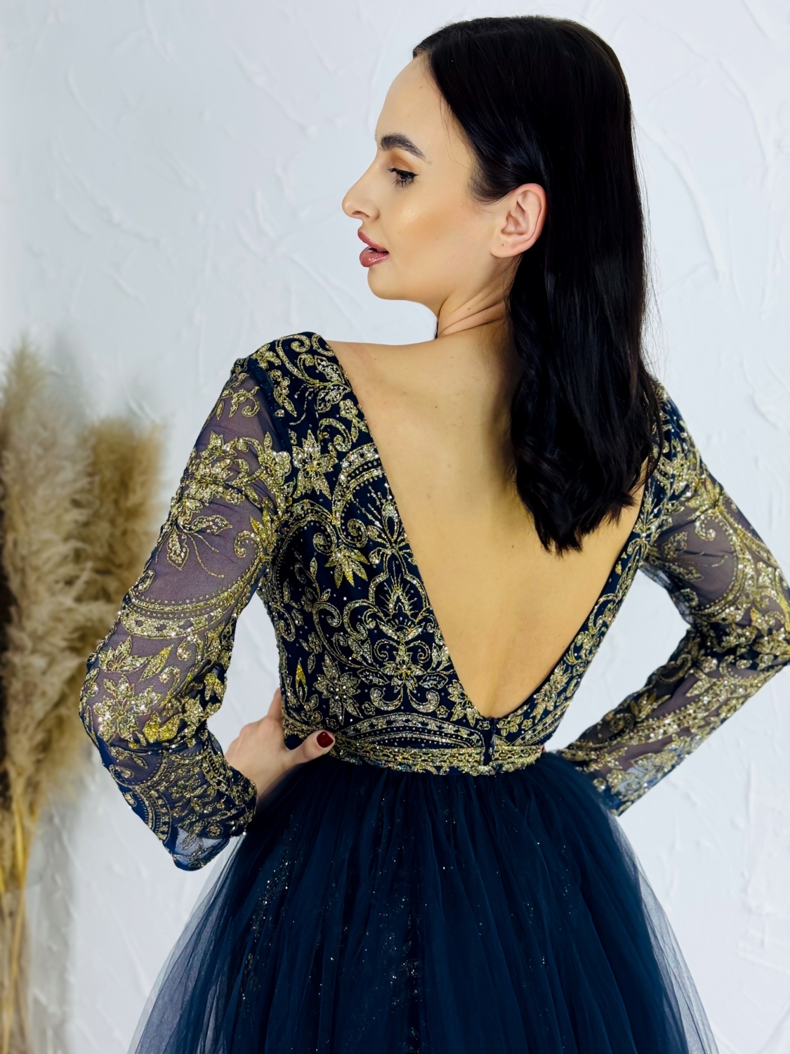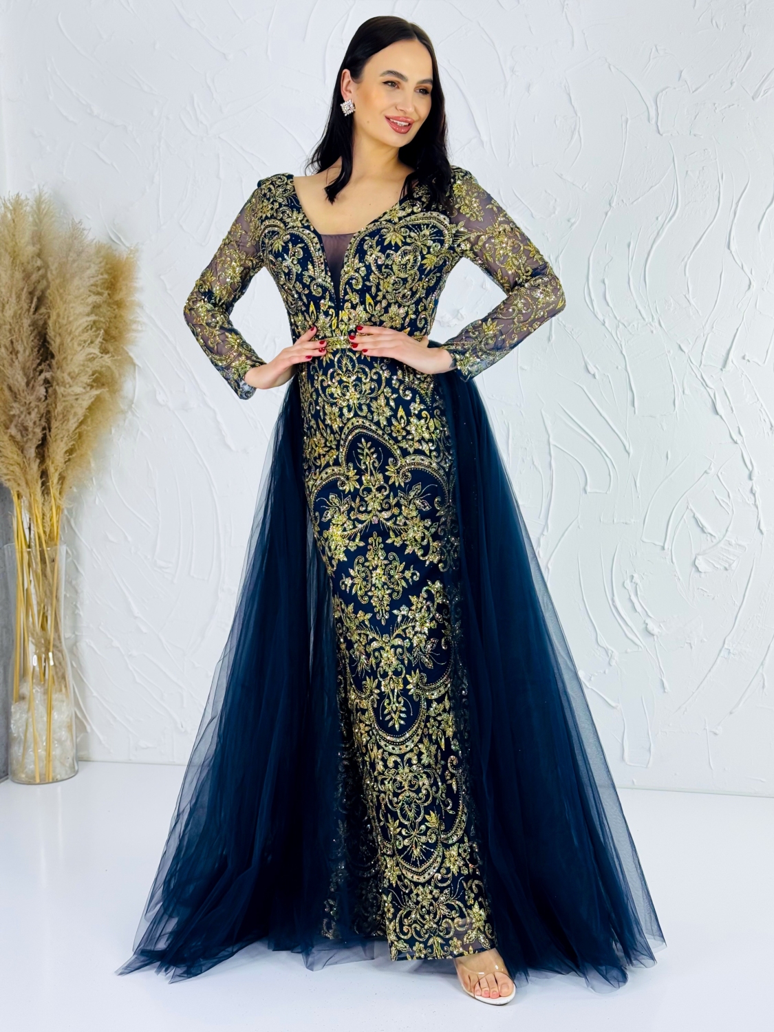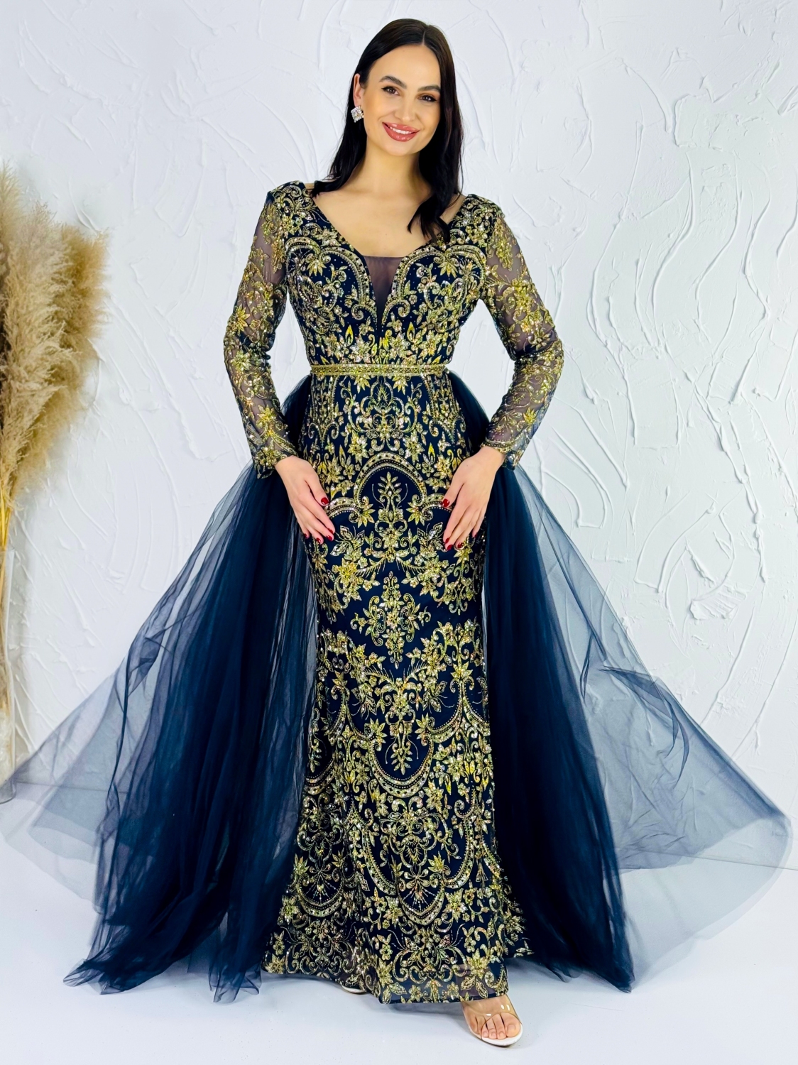 Tieto luxusné spoločenské šaty sú navrhnuté pre ženu, ktorá túži po výraznej elegancii, podmanivej kráse a absolútnej výnimočnosti. Sú dielom, ktoré okamžite upúta pozornosť svojou prepracovanou výšivkou, nádhernou siluetou a noblesou pripomínajúcou umelecké dielo. Vrchná časť šiat je zdobená detailnou, bohato štruktúrovanou ornamentálnou výšivkou, ktorá vytvára efekt luxusu a precízneho remeselného spracovania. Hlbší výstrih v tvare písmena V pôsobí žensky a elegantne, pričom predlžuje líniu krku a zároveň zachováva vkusný, vyvážený vzhľad. Dlhé priehľadné rukávy s rovnakým výšivkovým vzorom pridávajú modelu jemnosť a nadčasový charakter. Pás je opticky zvýraznený dekoratívnym lemom, ktorý prirodzene vytvára krásnu ženskú líniu. Sukňa je doplnená jemným, vzdušným tylom, ktorý pridáva šatám objem a pôsobivú „princeznovskú“ siluetu, no zároveň zostáva ľahký a elegantne splývavý. Podkladová látka spolu s bohatým zdobením vytvára luxusný kontrast, vďaka ktorému šaty pôsobia ako outfit určený pre kráľovskú udalosť alebo prestížny večer. Celkový dojem modelu je harmonický a mimoriadne reprezentatívny.