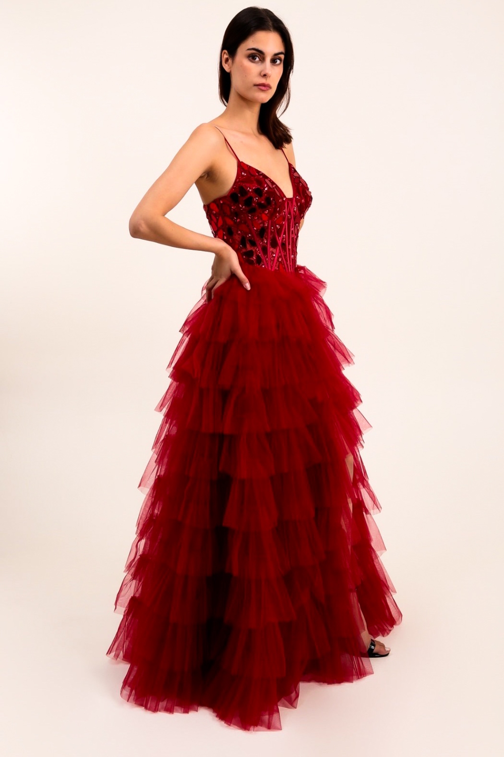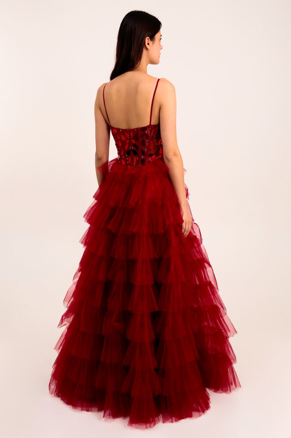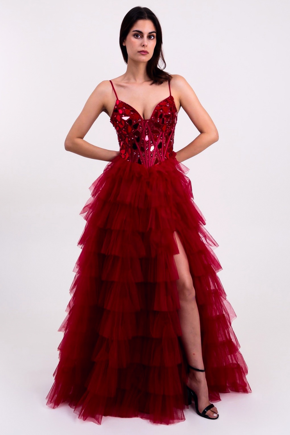 Tieto exkluzívne spoločenské šaty v bordovej farbe sú stelesnením luxusu, zvodnosti a ženskosti. Vytvorené pre ženy, ktoré chcú zažiariť a zanechať nezabudnuteľný dojem, spájajú moderný dizajn s nádychom kráľovskej elegancie. Horný korzetový diel je bohato zdobený lesklými aplikáciami v tvare kameňov a zrkadiel, ktoré odrážajú svetlo pri každom pohybe. Jemné ramienka dodávajú šatám ľahkosť a odhaľujú ramená, čím pôsobia veľmi žensky. Strih korzetu nádherne formuje postavu, zvýrazňuje pás a opticky predlžuje siluetu. Sukňa je vyrobená z viacerých vrstiev jemného tylu, usporiadaných do bohatých volánov, ktoré šatám dodávajú objem a dramatickosť. Vysoký rozparok na nohe vnáša do celkového vzhľadu odvážny a zmyselný prvok, no zároveň zostáva vkusný a elegantný. Odtieň týchto šiat je symbolom vášne, sebavedomia a sily. V kombinácii s dramatickým strihom pôsobia šaty ako umelecké dielo – ideálne na plesy, galavečery, exkluzívne oslavy či špeciálne príležitosti, kde je cieľom zažiariť a byť neprehliadnuteľná.