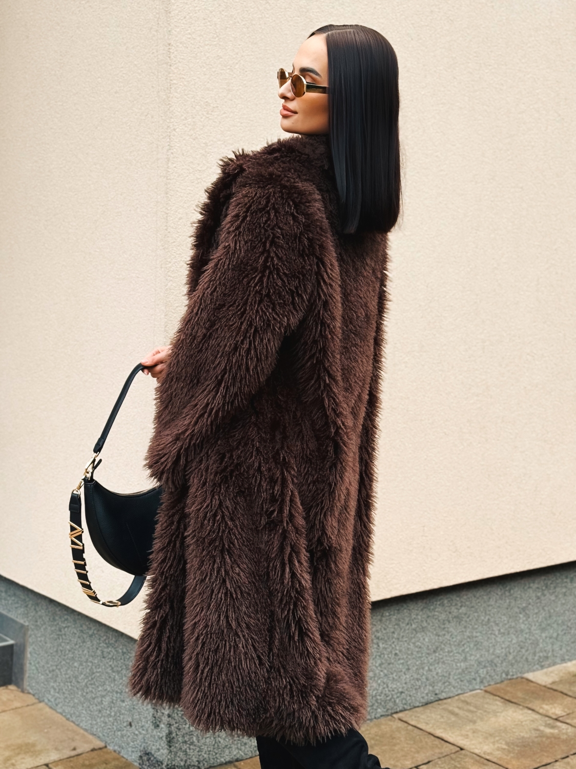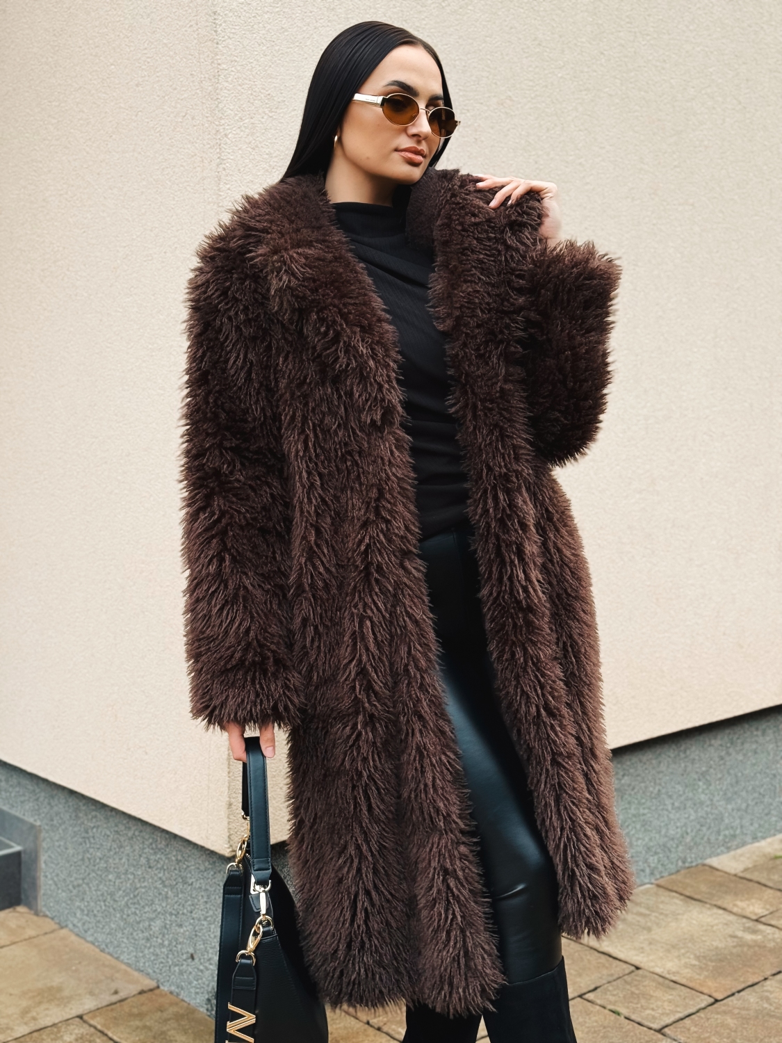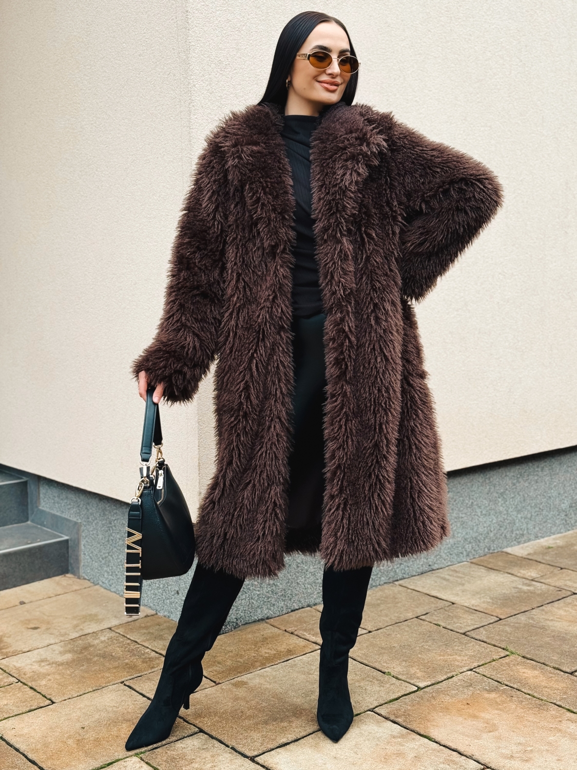 Tento exkluzívny dlhý ovečkový kožuch je dokonalým stelesnením elegancie, luxusu a nadčasového štýlu. Vyrobený z jemného a hustého „ovečkového“ materiálu, ponúka mimoriadny komfort, ktorý si zamiluješ už pri prvom nosení. Jeho mäkká, nadýchaná štruktúra zahreje aj počas tých najchladnejších dní, no zároveň pôsobí nesmierne žensky a moderným dojmom. Dĺžka kožucha vytvára krásnu predĺženú siluetu a dodáva outfitu výraz noblesy. Materiál je starostlivo spracovaný tak, aby si zachoval pružnosť a bohatý vzhľad aj po častom nosení. Kožuch sa nekrčí, neplstnatie a drží si svoj luxusný tvar. Prepracované detaily, kvalitná podšívka a precízne vypracované švy z neho robia kúsok, ktorý okamžite zvýrazní tvoj štýl. Praktické bočné vrecká sú nenápadne zapracované tak, aby nerušili čistý dizajn, no zároveň poskytli miesto pre ruky či drobnosti. Model je ideálny na bežné dni, ale aj na výnimočné udalosti – v kombinácii s čižmami, lodičkami či športovým outfitom vytvára vždy dokonalo šik vzhľad. Ak hľadáš kožuch, ktorý je zároveň teplý, módny a exkluzívny, tento ovečkový model je tou správnou voľbou. Modelka je vysoká 175 cm a oblečenú má veľkosť UNI,