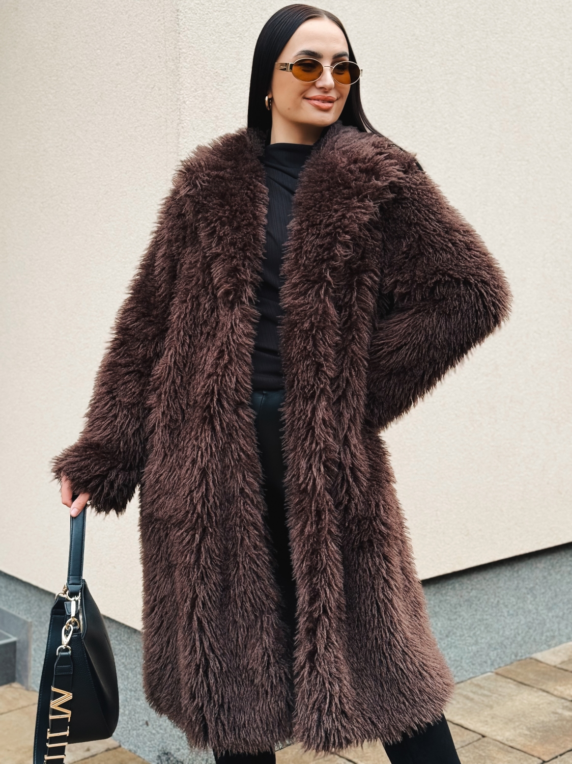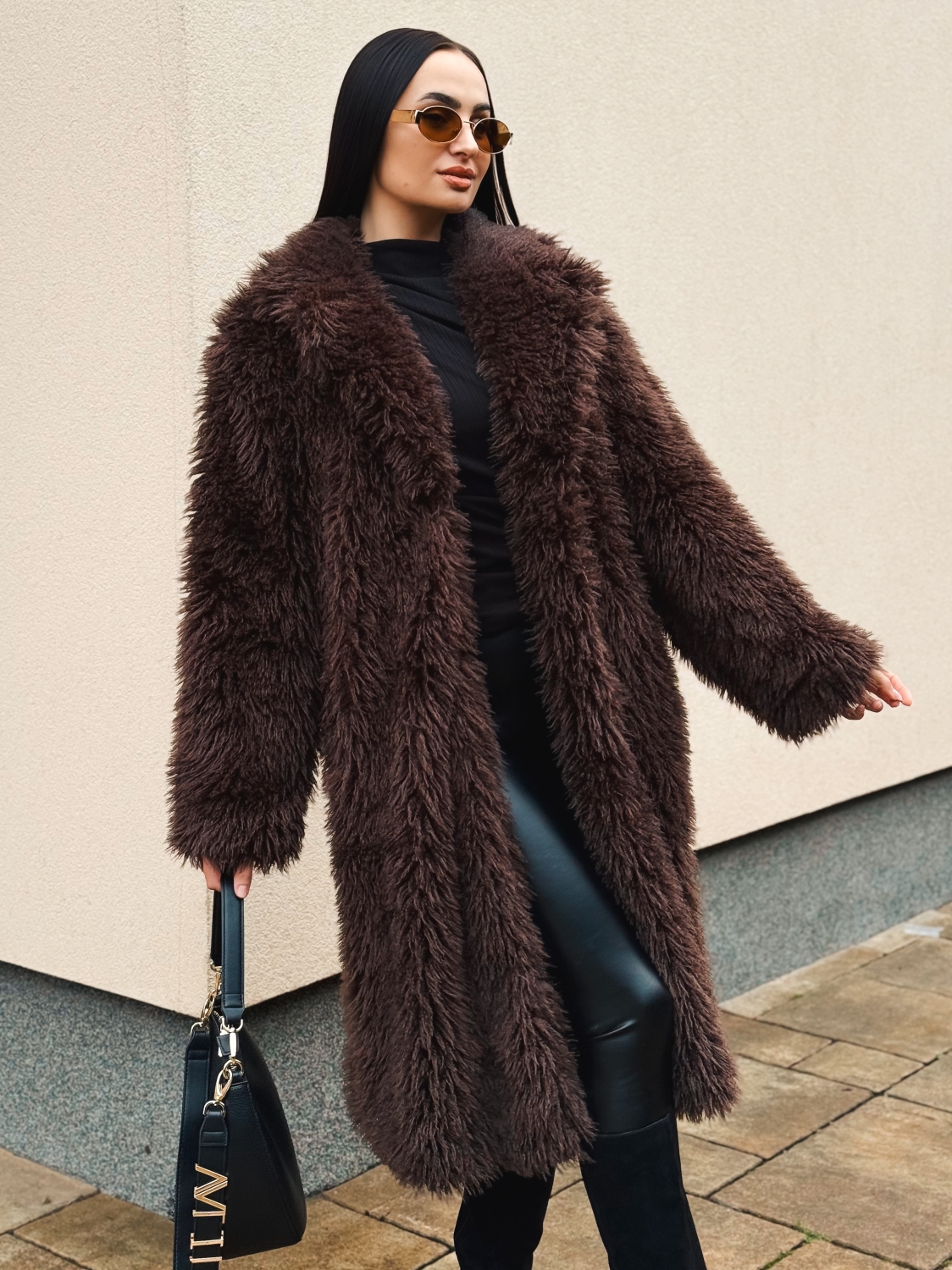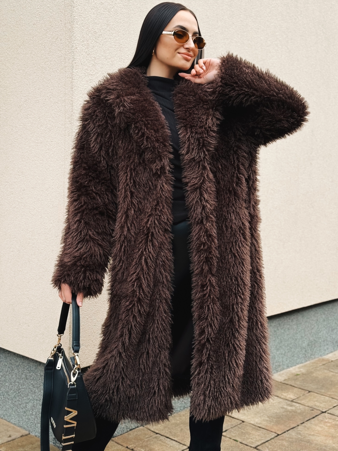 Tento exkluzívny dlhý ovečkový kožuch je dokonalým stelesnením elegancie, luxusu a nadčasového štýlu. Vyrobený z jemného a hustého „ovečkového“ materiálu, ponúka mimoriadny komfort, ktorý si zamiluješ už pri prvom nosení. Jeho mäkká, nadýchaná štruktúra zahreje aj počas tých najchladnejších dní, no zároveň pôsobí nesmierne žensky a moderným dojmom. Dĺžka kožucha vytvára krásnu predĺženú siluetu a dodáva outfitu výraz noblesy. Materiál je starostlivo spracovaný tak, aby si zachoval pružnosť a bohatý vzhľad aj po častom nosení. Kožuch sa nekrčí, neplstnatie a drží si svoj luxusný tvar. Prepracované detaily, kvalitná podšívka a precízne vypracované švy z neho robia kúsok, ktorý okamžite zvýrazní tvoj štýl. Praktické bočné vrecká sú nenápadne zapracované tak, aby nerušili čistý dizajn, no zároveň poskytli miesto pre ruky či drobnosti. Model je ideálny na bežné dni, ale aj na výnimočné udalosti – v kombinácii s čižmami, lodičkami či športovým outfitom vytvára vždy dokonalo šik vzhľad. Ak hľadáš kožuch, ktorý je zároveň teplý, módny a exkluzívny, tento ovečkový model je tou správnou voľbou. Modelka je vysoká 175 cm a oblečenú má veľkosť UNI,