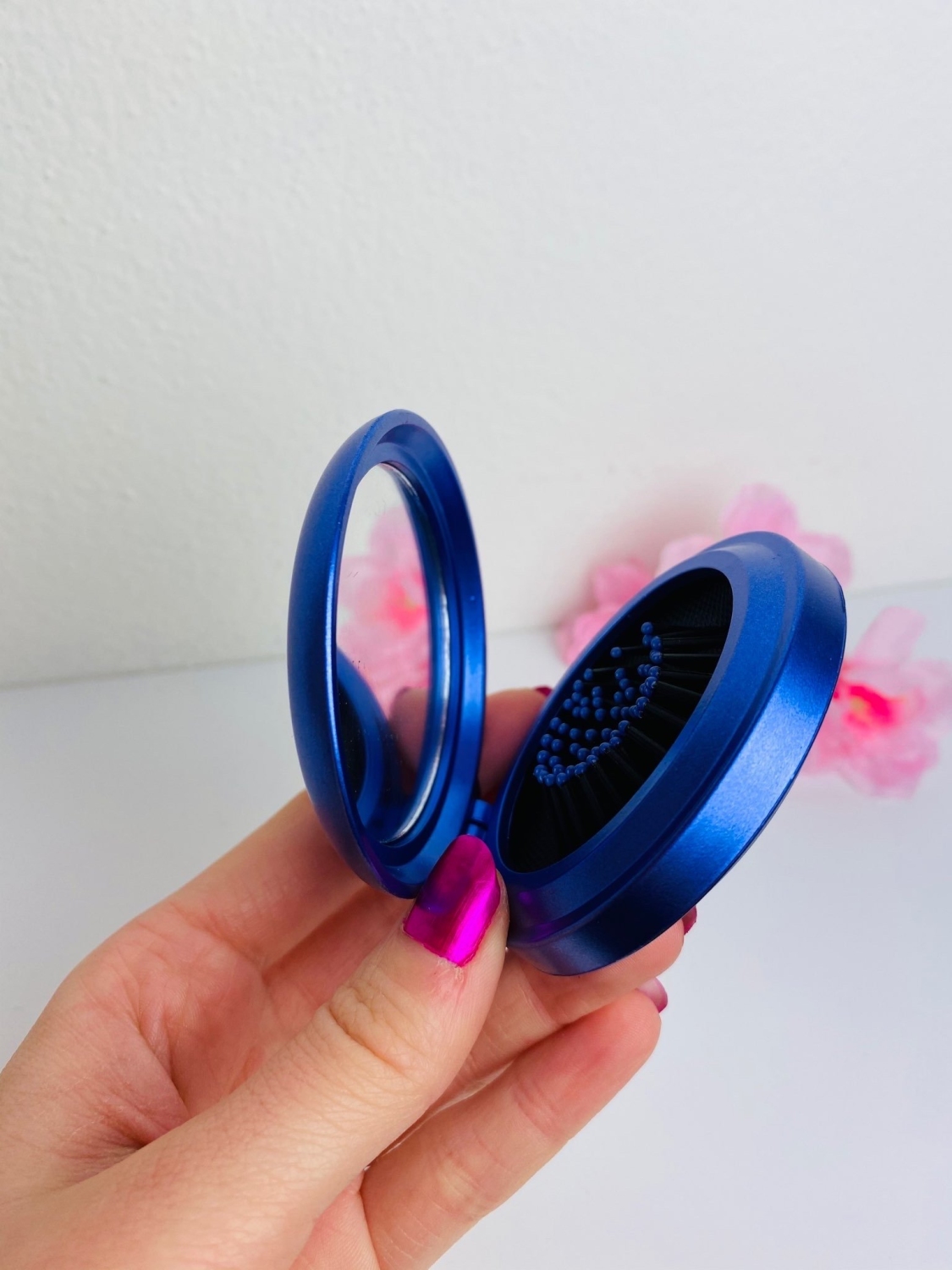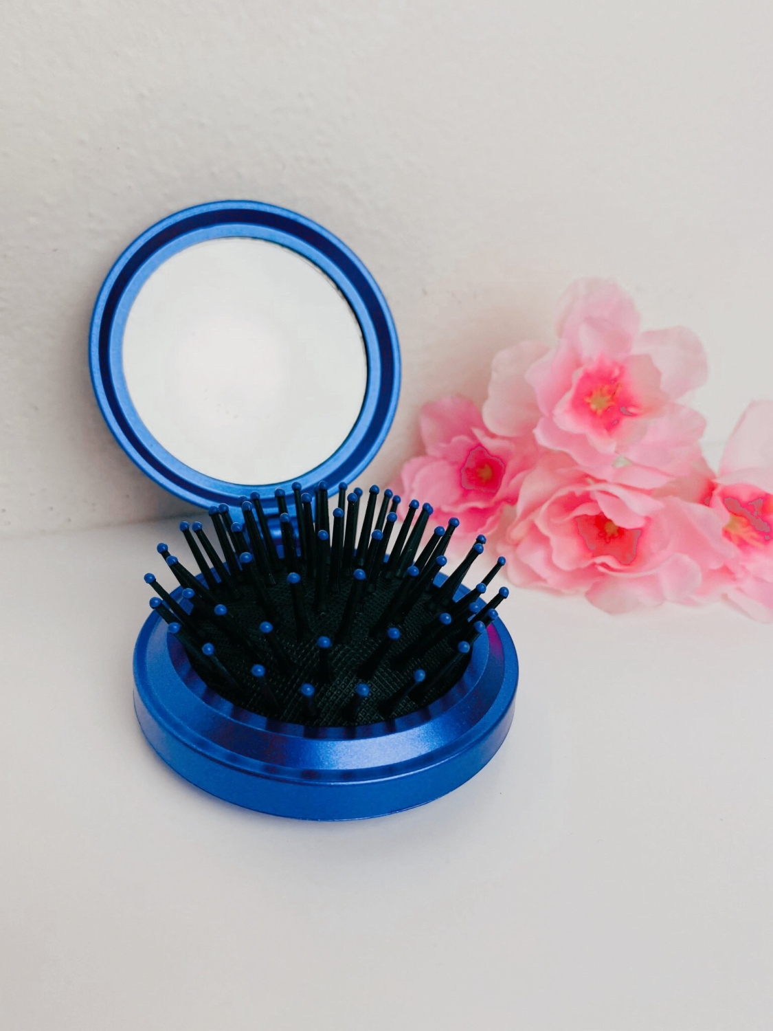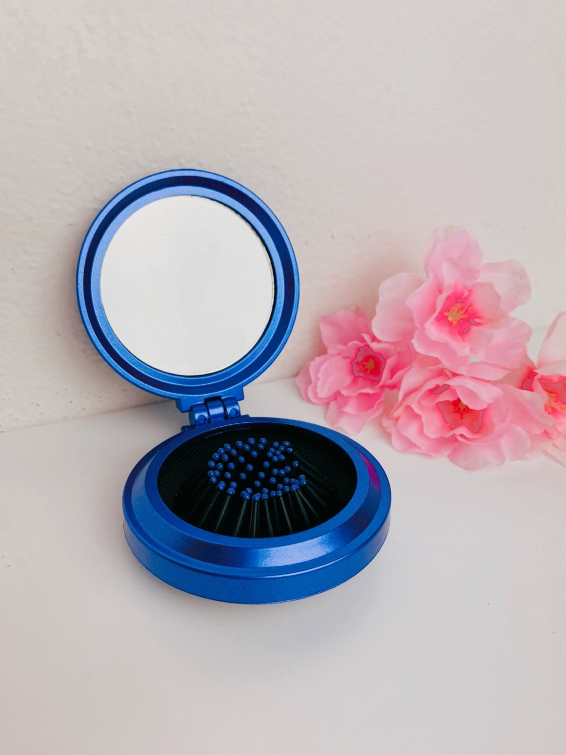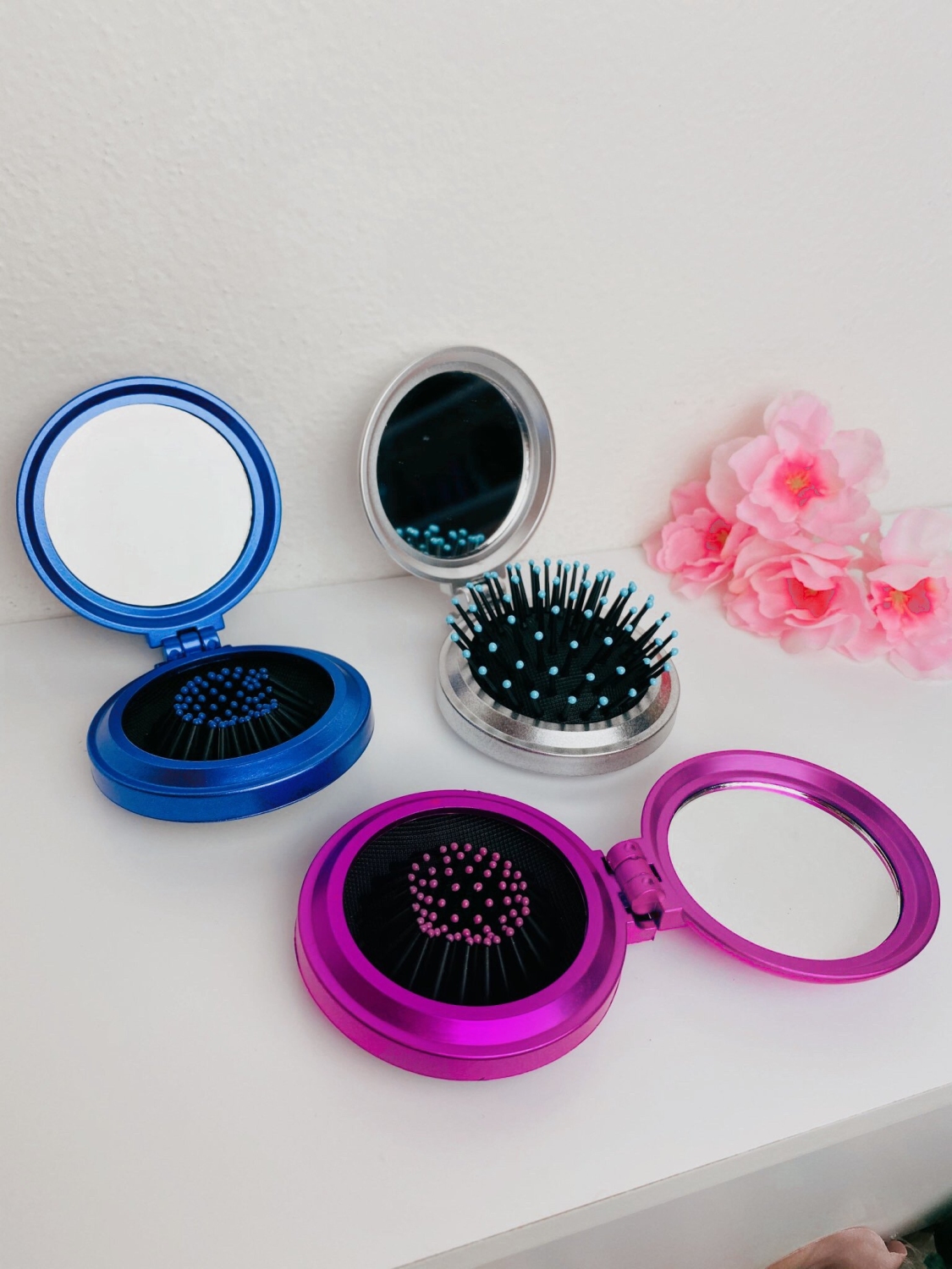 Praktická fialová skladacia kefa so zrkadielkom. Vďaka svojej veľkosti sa zmestí do každej kabelky, ľadvinky, ale i vrecka.