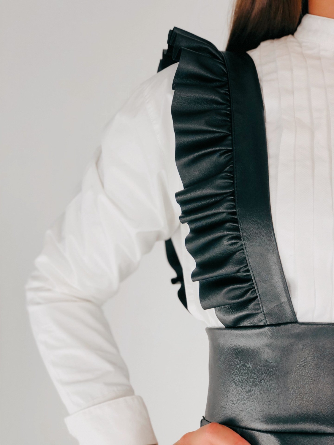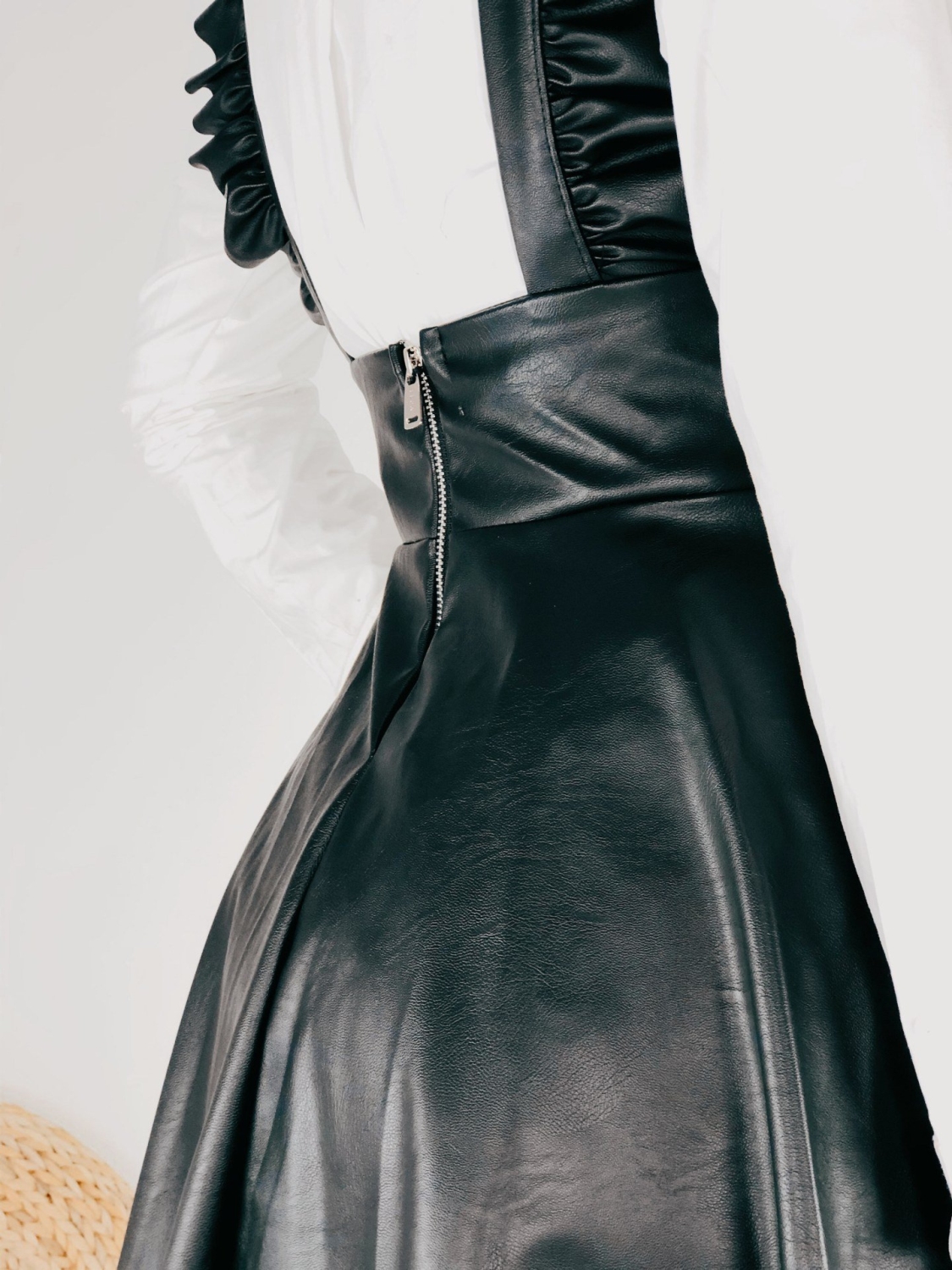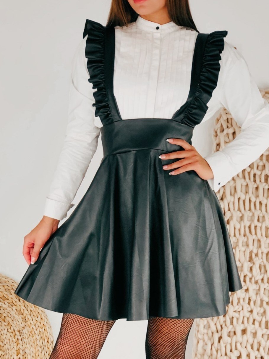 Dámska čierna koženková sukňa na traky, ktoré sú s volánovým lemom. Zapínanie vzadu na zips. Vhodná aj na zimu k čižmám a kabátu. Sukňa je vyrobená z klasickej, jemne sa lesknúcej kože, ktorá pôsobi veľmi sexi a sebavedomo. Doplňte svoj šatník týmto štýlovým kúskom, s ktorým zažiarite aj počas bežných dní. Modelka je vysoká 173 cm a oblečenú má veľkosť S.
