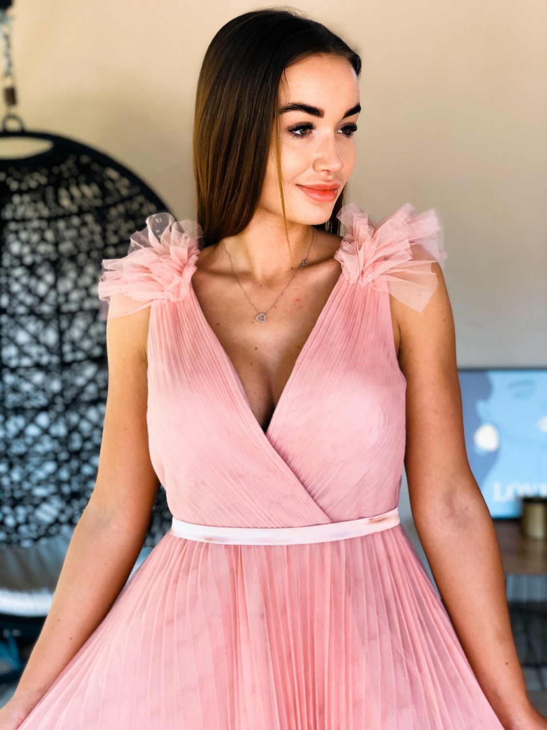 Dámske krátke ružové spoločenské šaty, ktoré sú z kvalitného a pohodlného materiálu. Zapínanie vzadu na zips. Vhodné na akúkoľvek spoločenskú udalosť. Modelka je vysoká 175 cm a oblečenú má veľkosť M.