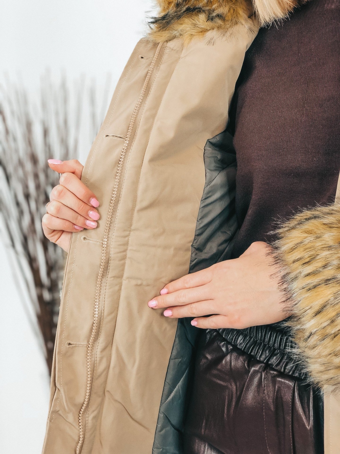 Dámska zimná bunda, ktorá je kvalitné a precízne prepracovaná v béžovej farbe. Bunda má zapínanie na zips. Kožušinka na rukávoch je odopínateľna. Neváhajte a zaobstarajte si i vy tento #musthave kúsok. Modelka je vysoká 175 cm a má oblečenú veľkosť M.