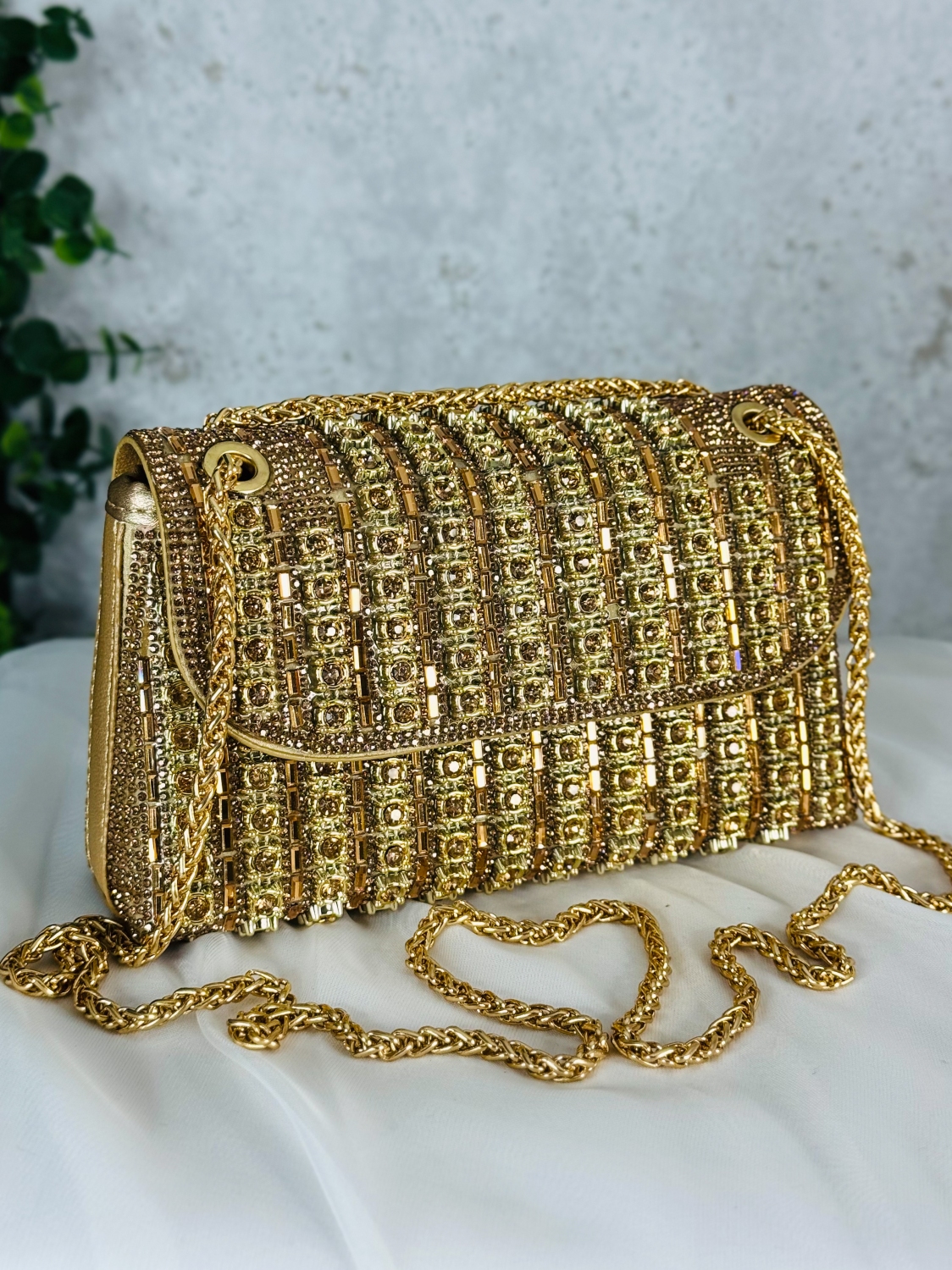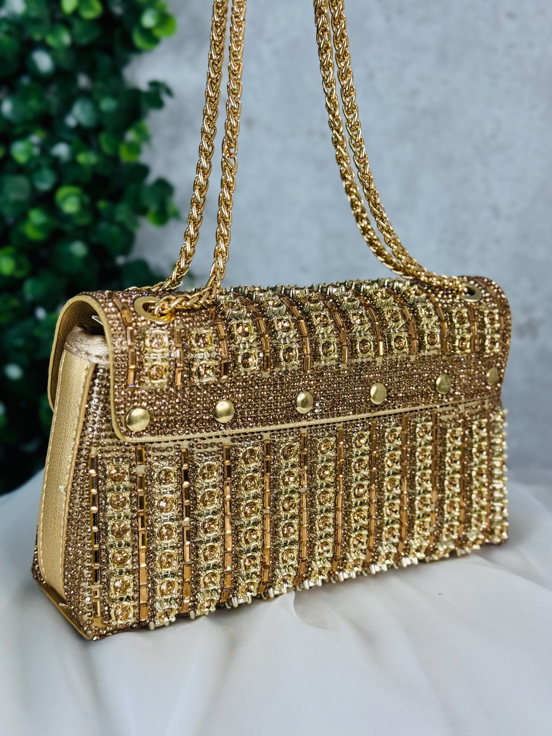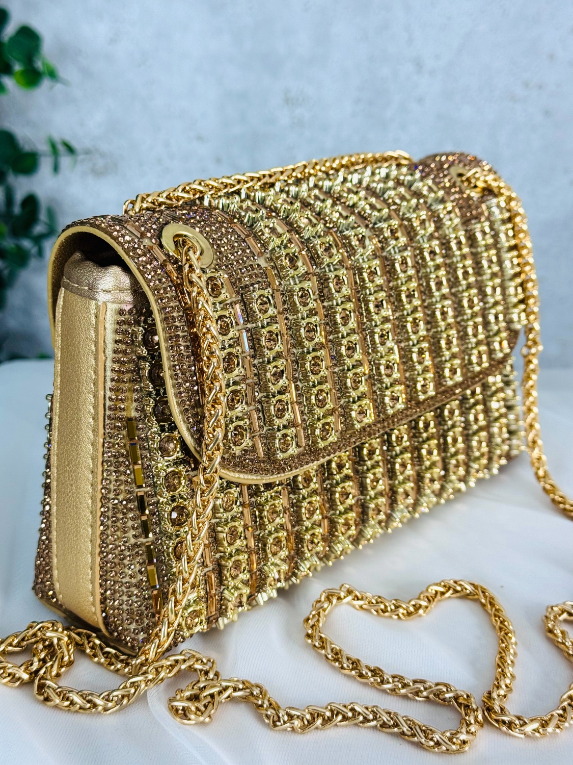 Luxusná spoločenská kabelka s ozdobnými kamienkami je kúsok, ktorý okamžite upúta každý pohľad. Jej povrch je zdobený stovkami trblietavých kamienkov, ktoré pri svetle žiaria ako malé kryštály a vytvárajú dojem absolútnej elegancie. Každý detail je premyslený tak, aby kabelka pôsobila noblesne, žensky a zároveň nadčasovo. Tvar kabelky je jemný a sofistikovaný, čo jej dodáva luxusný vzhľad vhodný na plesy, večierky, svadby či slávnostné príležitosti. Vďaka pevnej konštrukcii si zachováva svoj krásny tvar a bezpečne uchová vaše nevyhnutnosti – mobil, rúž, kľúče či drobnú kozmetiku. Pohodlné zapínanie a kvalitné spracovanie zaručujú komfort pri nosení. Tento model je presne ten typ doplnku, ktorý dokáže pozdvihnúť akýkoľvek outfit na úplne inú úroveň. Stačí ju chytiť do ruky a okamžite získate pocit výnimočnosti. Je to kabelka pre ženy, ktoré milujú luxus, detail a trblietavý efekt, ktorý sa nedá prehliadnuť.