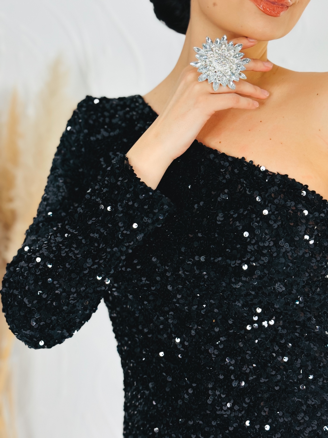 Tieto exkluzívne spoločenské šaty sú stelesnením elegancie, ženskosti a nadčasového glamour štýlu. Asymetrický strih s jedným rukávom pôsobí mimoriadne sofistikovane a zároveň moderne, vďaka čomu sú šaty ideálnou voľbou na plesy, galavečery, svadby, stužkové, silvestrovské oslavy či iné výnimočné spoločenské udalosti. Flitre dodávajú šatám luxusný lesk, ktorý krásne odráža svetlo pri každom pohybe a zaručí, že budete neprehliadnuteľná. Priliehavý strih dokonale zvýrazňuje ženské krivky, opticky zoštíhľuje postavu a pôsobí veľmi elegantne. Dĺžka šiat nad kolená dodáva modelu zvodný, no stále vkusný charakter. Praktické zapínanie na bočný zips zabezpečuje pohodlné obliekanie a zároveň nenarušuje čistý dizajn šiat. Kvalitný materiál je príjemný na nosenie, dobre drží tvar a poskytuje komfort aj počas dlhého večera plného tanca a zábavy. Šaty sú dostupné vo viacerých farebných prevedeniach, vďaka čomu si každá žena môže vybrať variant, ktorý najlepšie vystihuje jej osobnosť a štýl – od klasických elegantných tónov až po výrazné, luxusné farby.