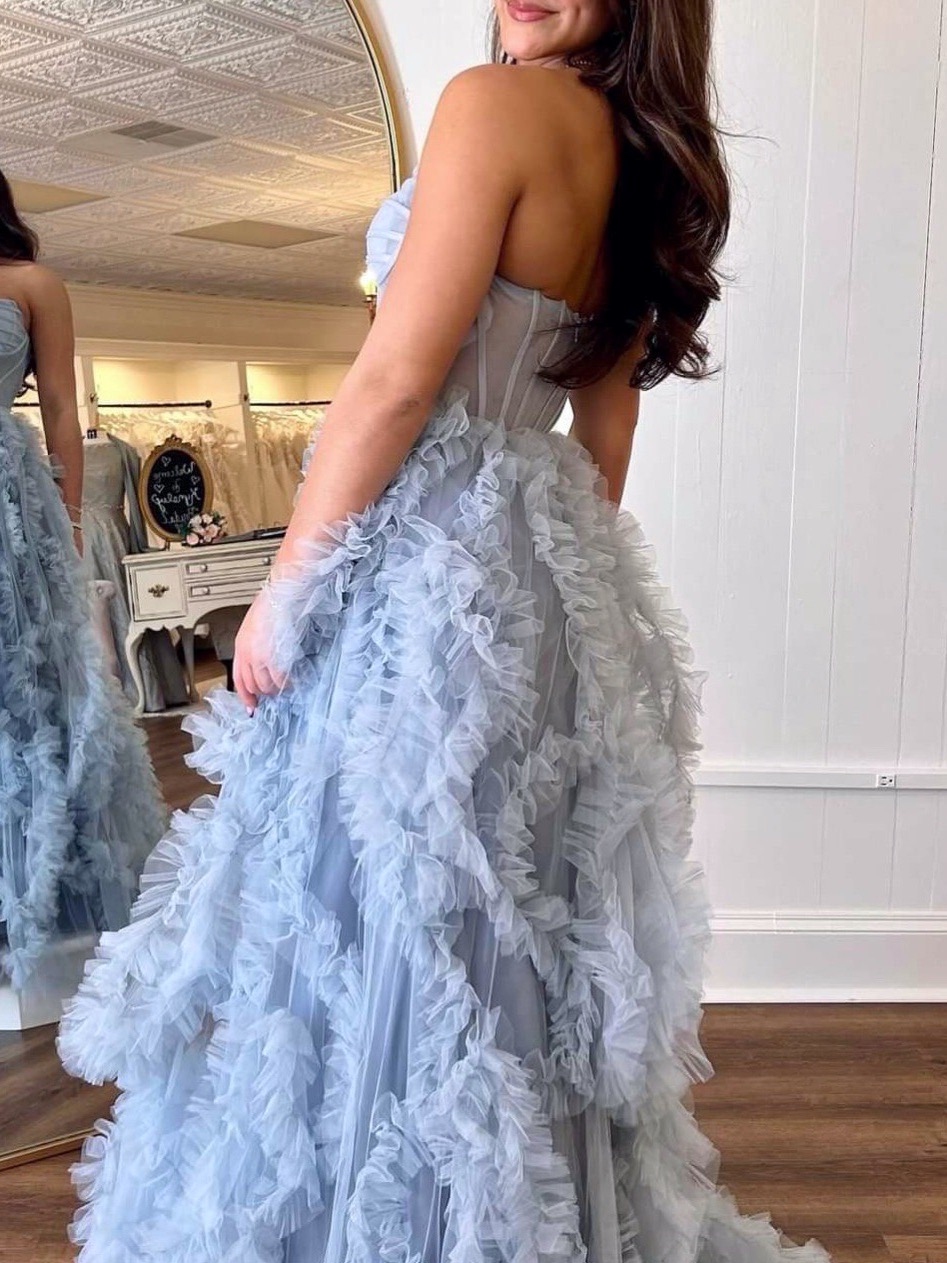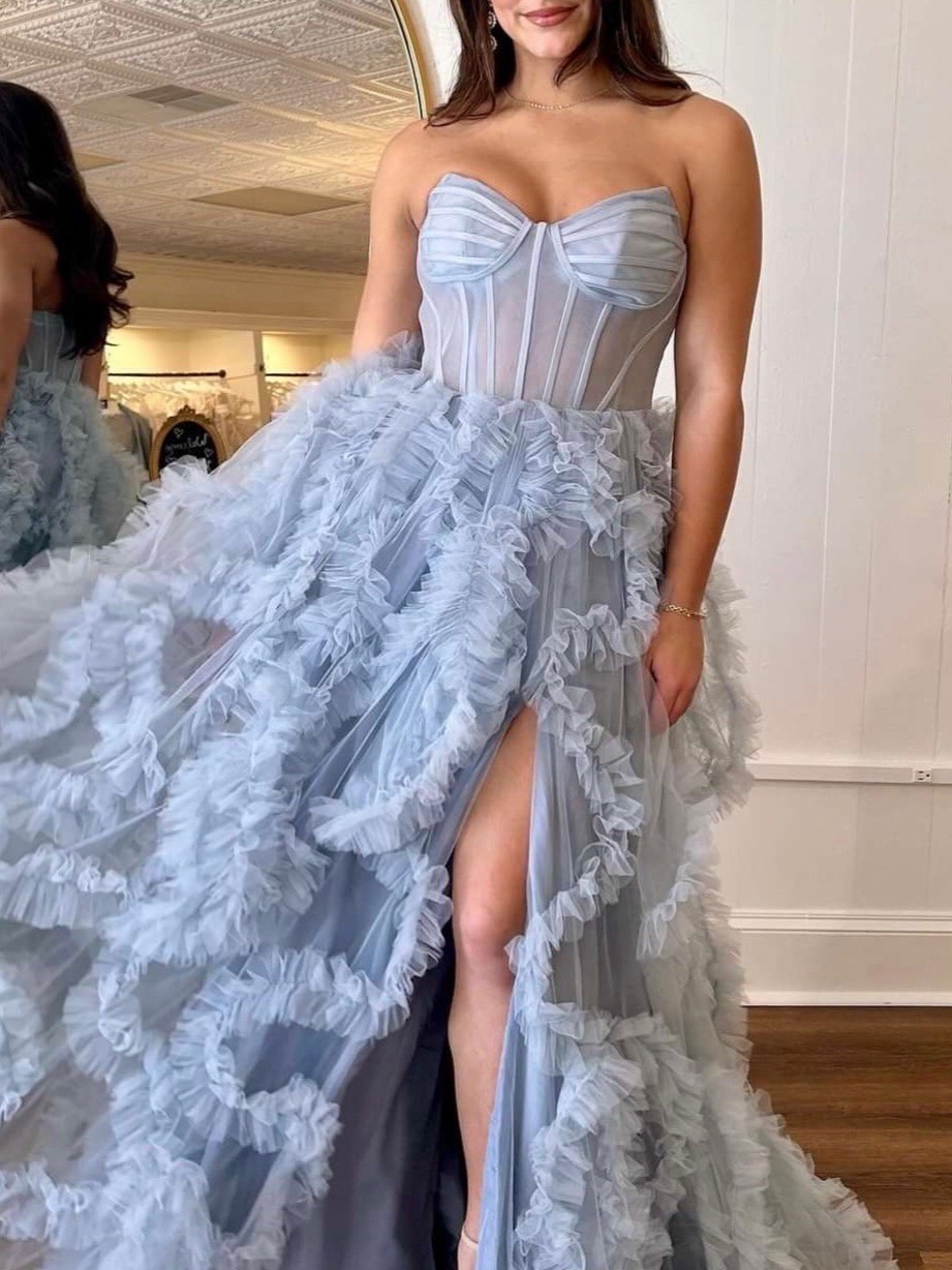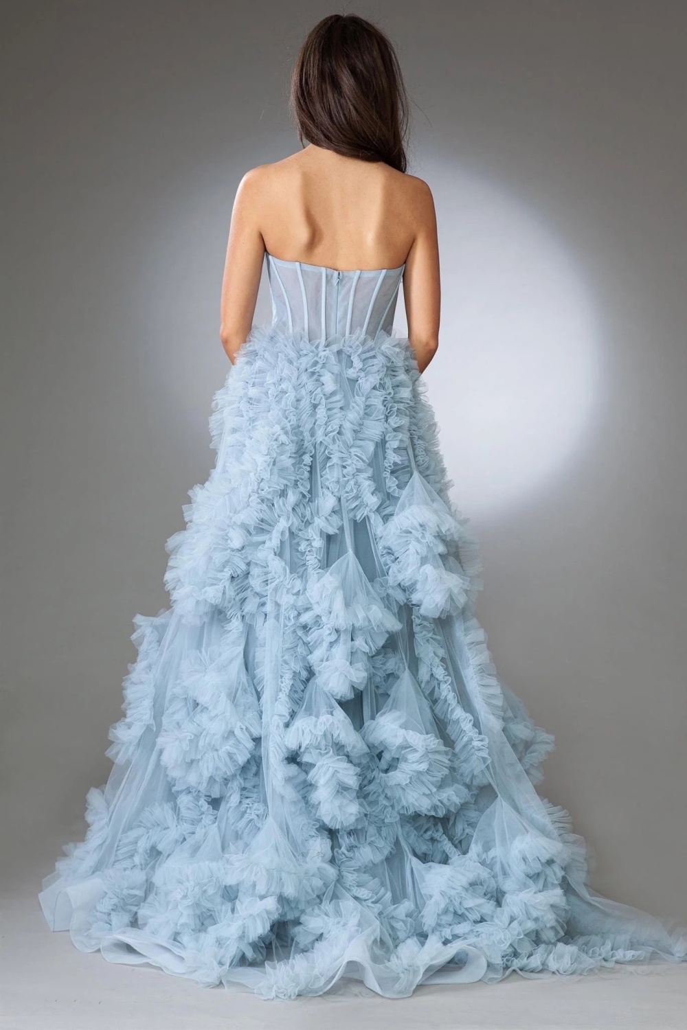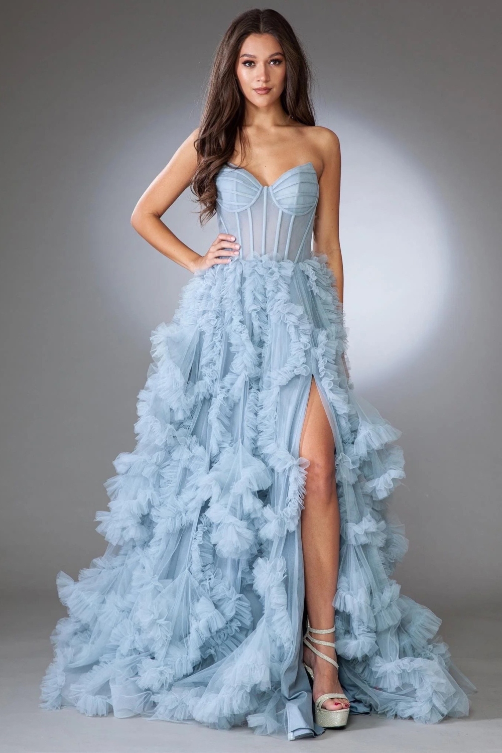Predstavujeme luxusné dlhé spoločenské šaty v jemnej svetlomodrej farbe, ktoré kombinujú eleganciu a sofistikovaný štýl. Vrchná časť šiat je navrhnutá ako korzet, ktorý dokonale zvýrazňuje ženskú siluetu, podčiarkuje pás a dodáva postave ladný tvar. Materiál korzetu je pevný, no zároveň pohodlný, s jemnými švami a možnosťou jemného tvarovania. Sukňa šiat je dlhá, splývavá a vzdušná, čím vytvára pocit ľahkosti a pohybu pri každom kroku. Elegantný rozparok na boku dodáva šatám nádych zvodnosti a súčasne umožňuje pohodlný pohyb. Svetlomodrá farba šiat pôsobí nežne, sviežo a sofistikovane, čo robí tieto šaty ideálnymi pre spoločenské udalosti, plesy, svadby či večerné recepcie. Každý detail šiat je premyslený – od jemného zakončenia výstrihu, cez precízne spracované švy, až po luxusný materiál, ktorý jemne odráža svetlo a zvýrazňuje krásu farby. Tieto šaty sú stelesnením noblesy a dokonalého štýlu pre ženy, ktoré chcú zažiariť.
