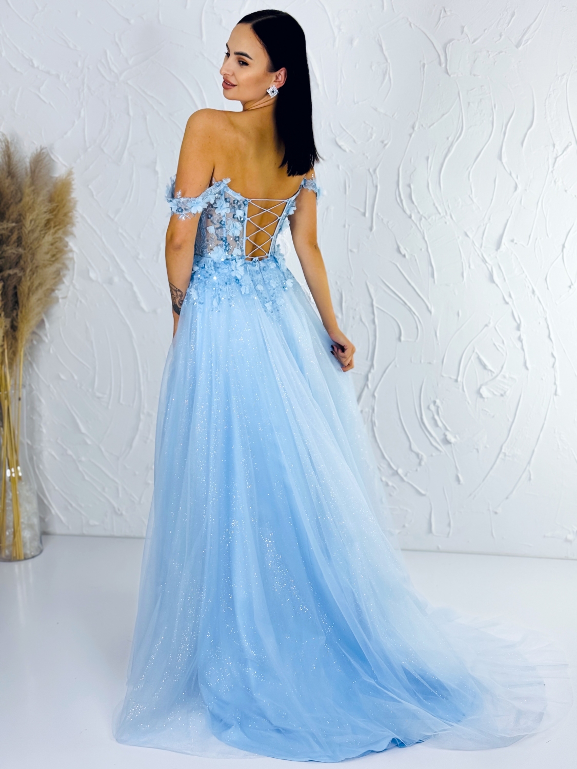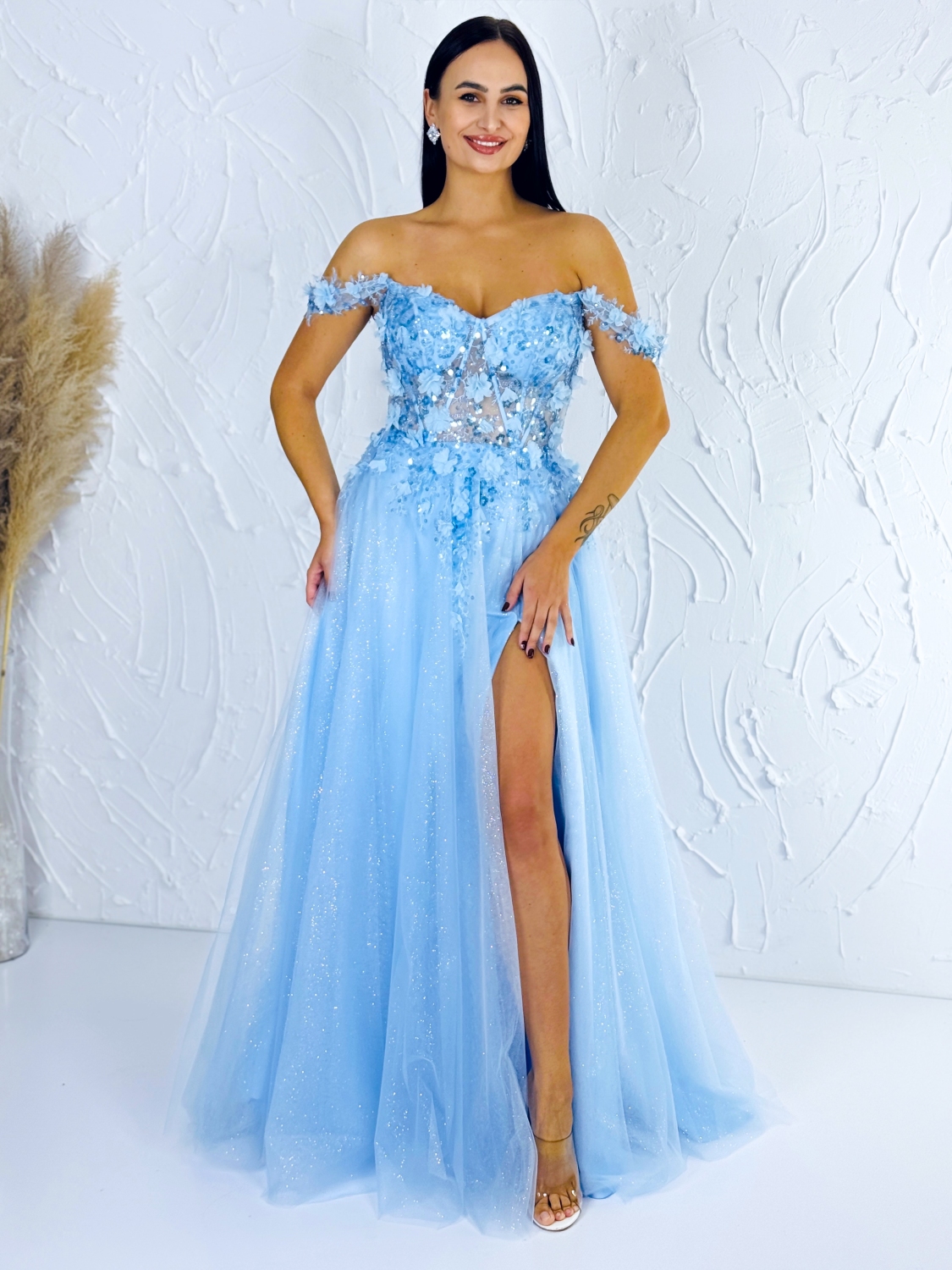 Dámske dlhé luxusné trblietavé spoločenské šaty so sexi rozparkom – svetlo modré. Zaži pocit kráľovskej elegancie s týmito ohromujúcimi dlhými spoločenskými šatami, ktoré sú stelesnením luxusu a ženskosti. Vyrobené z kvalitného, jemne lesklého materiálu s trblietavými detailmi, tieto šaty očaria svojou jemnou svetlo modrou farbou, ktorá pôsobí nežne, ale zároveň vyžaruje sofistikovaný štýl. Strih a dizajn: Šaty sú navrhnuté tak, aby lichotili každej postave. Dlhý padavý strih opticky predlžuje postavu, zatiaľ čo sexi rozparok pridáva nádych zvodnosti a zároveň umožňuje pohodlný pohyb. Jemne tvarovaný vrch so subtilným výstrihom krásne zdôrazňuje dekolt. Materiál a komfort: Luxusný lesklý materiál šiat je príjemný na dotyk a zároveň poskytuje pohodlie po celý večer. Trblietavé prvky dodávajú šatám sofistikovaný glam efekt, ktorý sa nádherne leskne pri každom svetle – či už pri romantickom sviečkovom večere, alebo na tanečnom parkete.