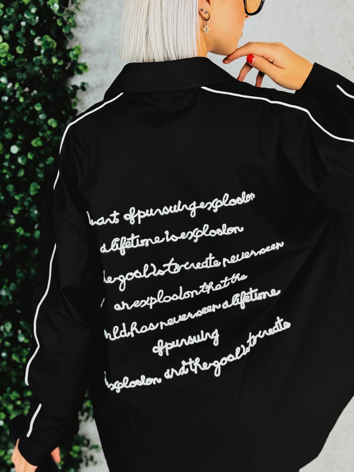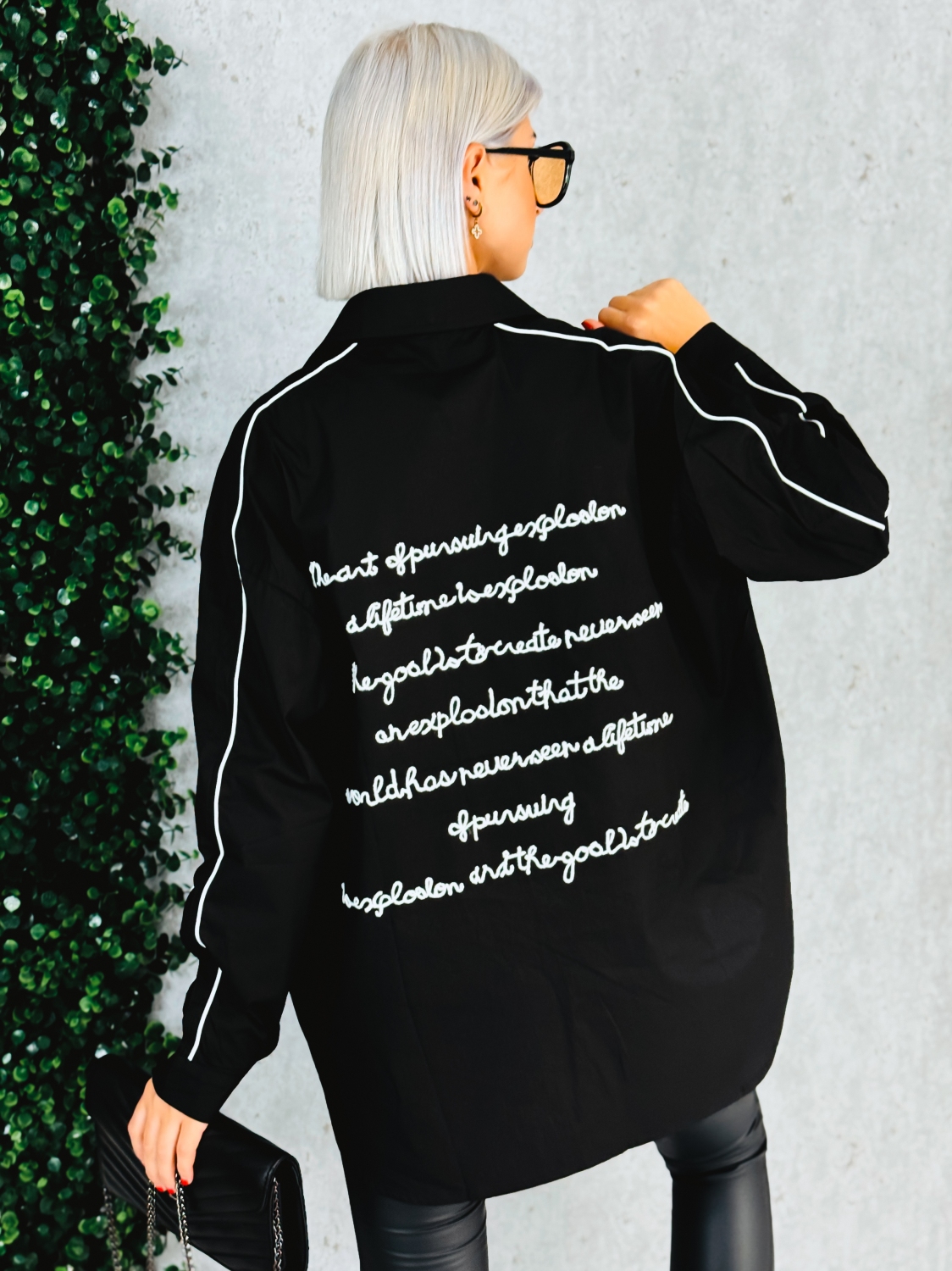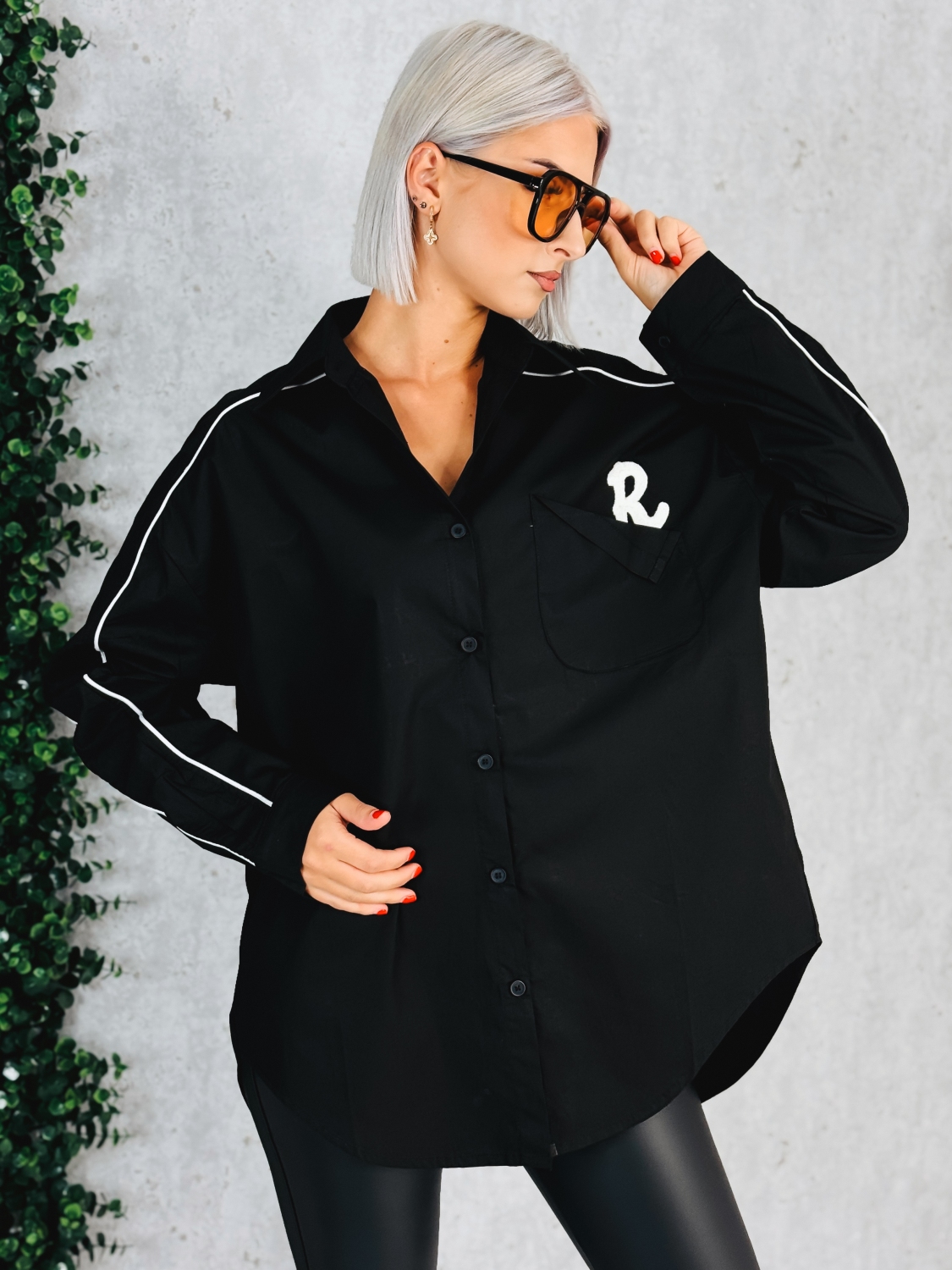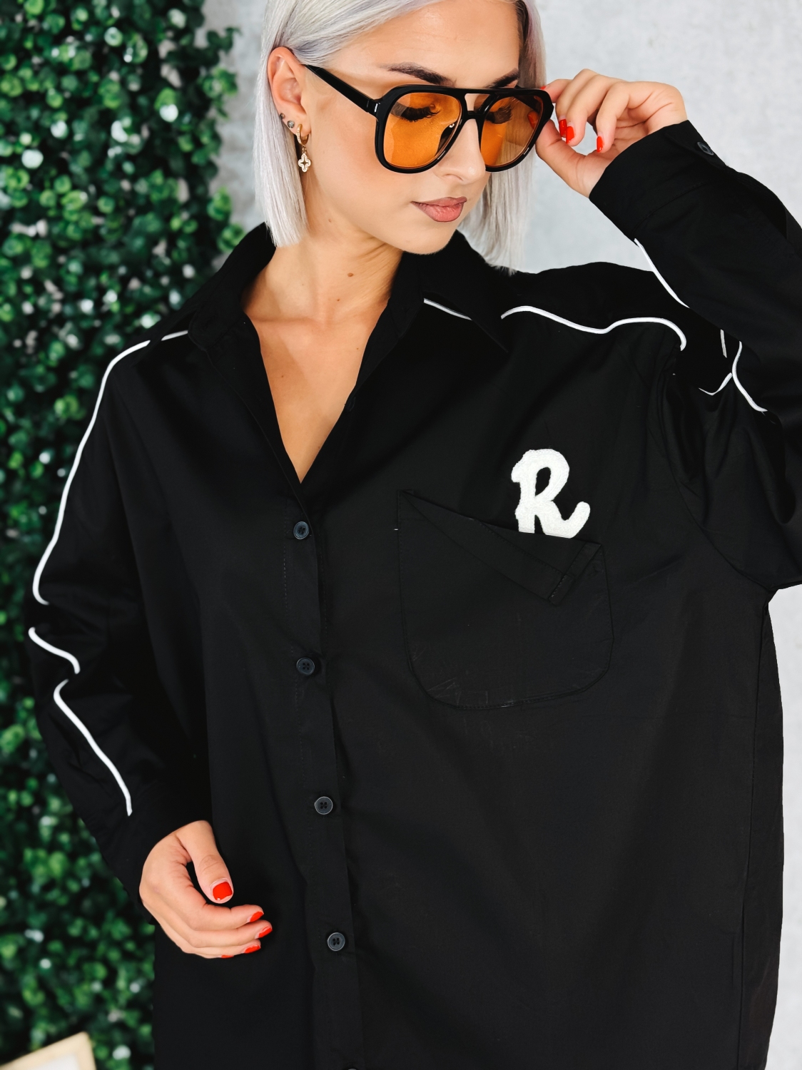 Táto dámska košeľa je štýlový a moderný kúsok, ktorý spája pohodlie s trendovým dizajnom. Je voľného oversize strihu, vďaka čomu pôsobí ležérne a zároveň elegantne. Čierna farba dodáva čistotu a univerzálnosť, pričom kontrastné biele detaily – tenké pásiky pozdĺž rukávov a výšivka na vrecku – jej dodávajú športovo-elegantný nádych. Košeľa má klasický golier, zapínanie na gombíky po celej dĺžke a dlhé rukávy, ktoré možno nosiť vyhrnuté pre ešte uvoľnenejší vzhľad. Vpredu zaujme vrecko s decentným písmenom R, zatiaľ čo zadná časť je ozdobená výrazným čiernym nápisom vo forme ručne pôsobiacej výšivky, ktorý jej dáva originálny charakter. Modelka má oblečenú veľkosť UNI.