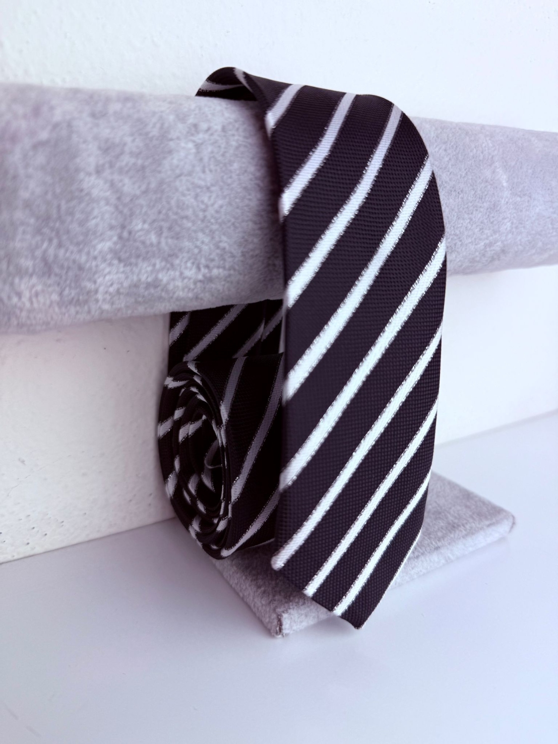 Pánska čierna saténová úzka kravata s bielymi pásikmi a striebornou niťou. Kravata je neodmysliteľnou súčasťou elegancie. Vhodná nielen pre spoločenské udalosti ako sú svadba, stužková a ples, ale aj ako skvelý doplnok office looku. Vyberte si tú svoju z našej širokej ponuky.