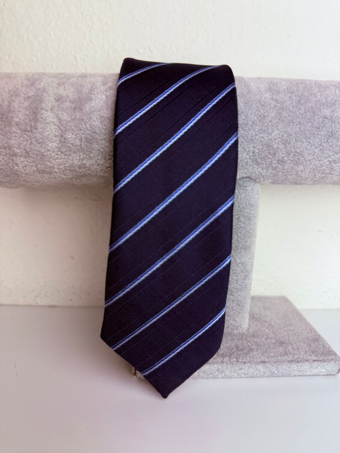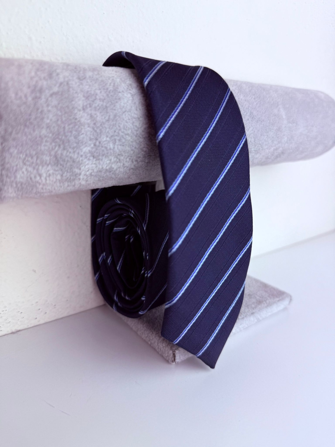 Pánska tmavá modrá saténová úzka kravata so svetlejšími pásikmi. Kravata je neodmysliteľnou súčasťou elegancie. Vhodná nielen pre spoločenské udalosti ako sú svadba, stužková a ples, ale aj ako skvelý doplnok office looku. Vyberte si tú svoju z našej širokej ponuky.