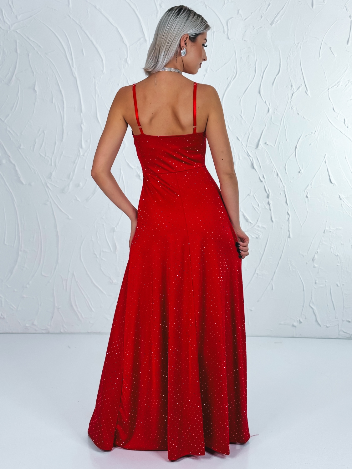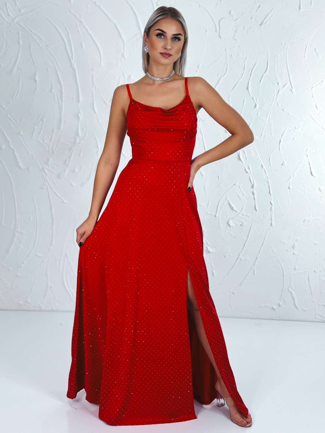 Tieto dámske spoločenské šaty sú navrhnuté s dôrazom na eleganciu, vhodné na slávnostné príležitosti, plesy, svadby alebo večerné eventy. Materiál je jemný a príjemný na dotyk, s jemnými kamienkami rozptýlenými po celej dĺžke šiat, čo dodáva šatám luxusný a žiarivý efekt pri každom pohybe. Strih je dlhý až po zem, čím opticky predlžuje postavu, a elegantný vysoký rozparok na jednej strane pridáva šatám nádych zmyselnosti a dynamiky. Horná časť šiat je zdobená mierne riaseným výstrihom a tenkými ramienkami, ktoré jemne odhaľujú ramená a dekolt, pričom zachovávajú sofistikovaný a elegantný vzhľad. Zadná časť šiat sa zapína na diskrétny zips, ktorý umožňuje pohodlné obliekanie a zároveň zabezpečuje dokonalé priliehanie šiat k postave. Vďaka precíznemu strihu sa šaty krásne prispôsobia krivkám tela a zvýraznia ženskú siluetu, pričom poskytujú komfort pri pohybe. Tieto šaty sú ideálne pre ženy, ktoré chcú pôsobiť elegantne, štýlovo a zároveň jemne zmyselne, pričom každý detail – od jemných kamienkov, cez rozparok až po zapínanie na zips – je premyslený tak, aby vytvoril harmonický a luxusný celok.