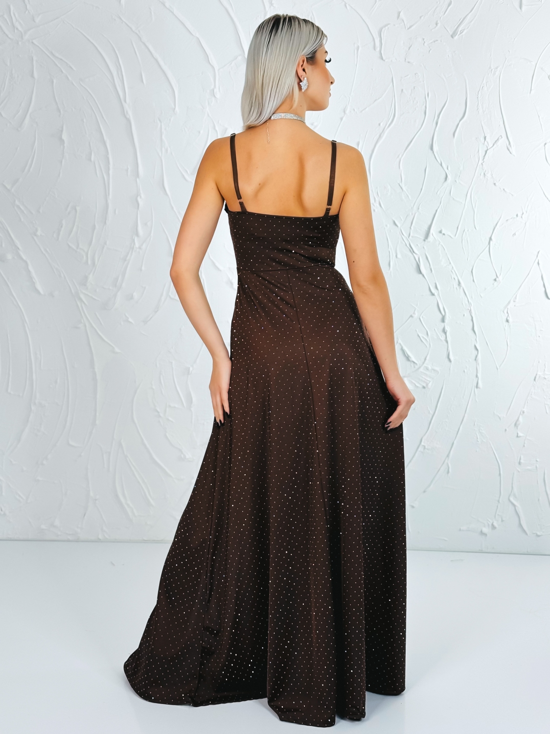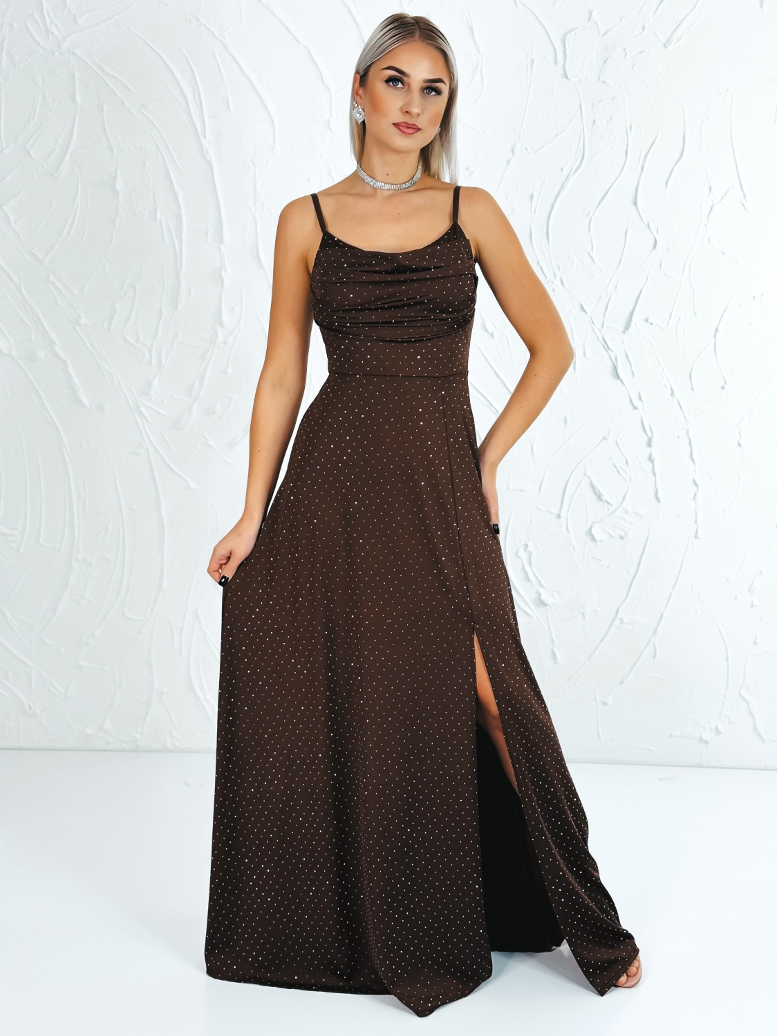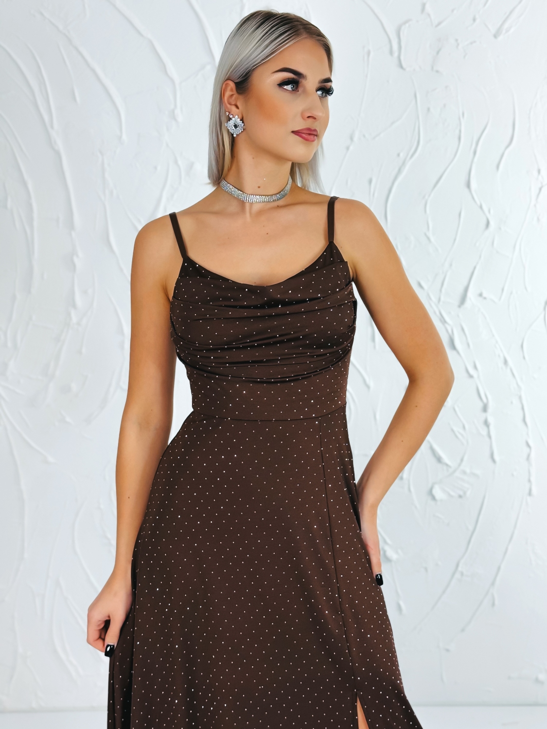 Tieto dámske spoločenské šaty sú navrhnuté s dôrazom na eleganciu, vhodné na slávnostné príležitosti, plesy, svadby alebo večerné eventy. Materiál je jemný a príjemný na dotyk, s jemnými kamienkami rozptýlenými po celej dĺžke šiat, čo dodáva šatám luxusný a žiarivý efekt pri každom pohybe. Strih je dlhý až po zem, čím opticky predlžuje postavu, a elegantný vysoký rozparok na jednej strane pridáva šatám nádych zmyselnosti a dynamiky. Horná časť šiat je zdobená mierne riaseným výstrihom a tenkými ramienkami, ktoré jemne odhaľujú ramená a dekolt, pričom zachovávajú sofistikovaný a elegantný vzhľad. Zadná časť šiat sa zapína na diskrétny zips, ktorý umožňuje pohodlné obliekanie a zároveň zabezpečuje dokonalé priliehanie šiat k postave. Vďaka precíznemu strihu sa šaty krásne prispôsobia krivkám tela a zvýraznia ženskú siluetu, pričom poskytujú komfort pri pohybe. Tieto šaty sú ideálne pre ženy, ktoré chcú pôsobiť elegantne, štýlovo a zároveň jemne zmyselne, pričom každý detail – od jemných kamienkov, cez rozparok až po zapínanie na zips – je premyslený tak, aby vytvoril harmonický a luxusný celok.