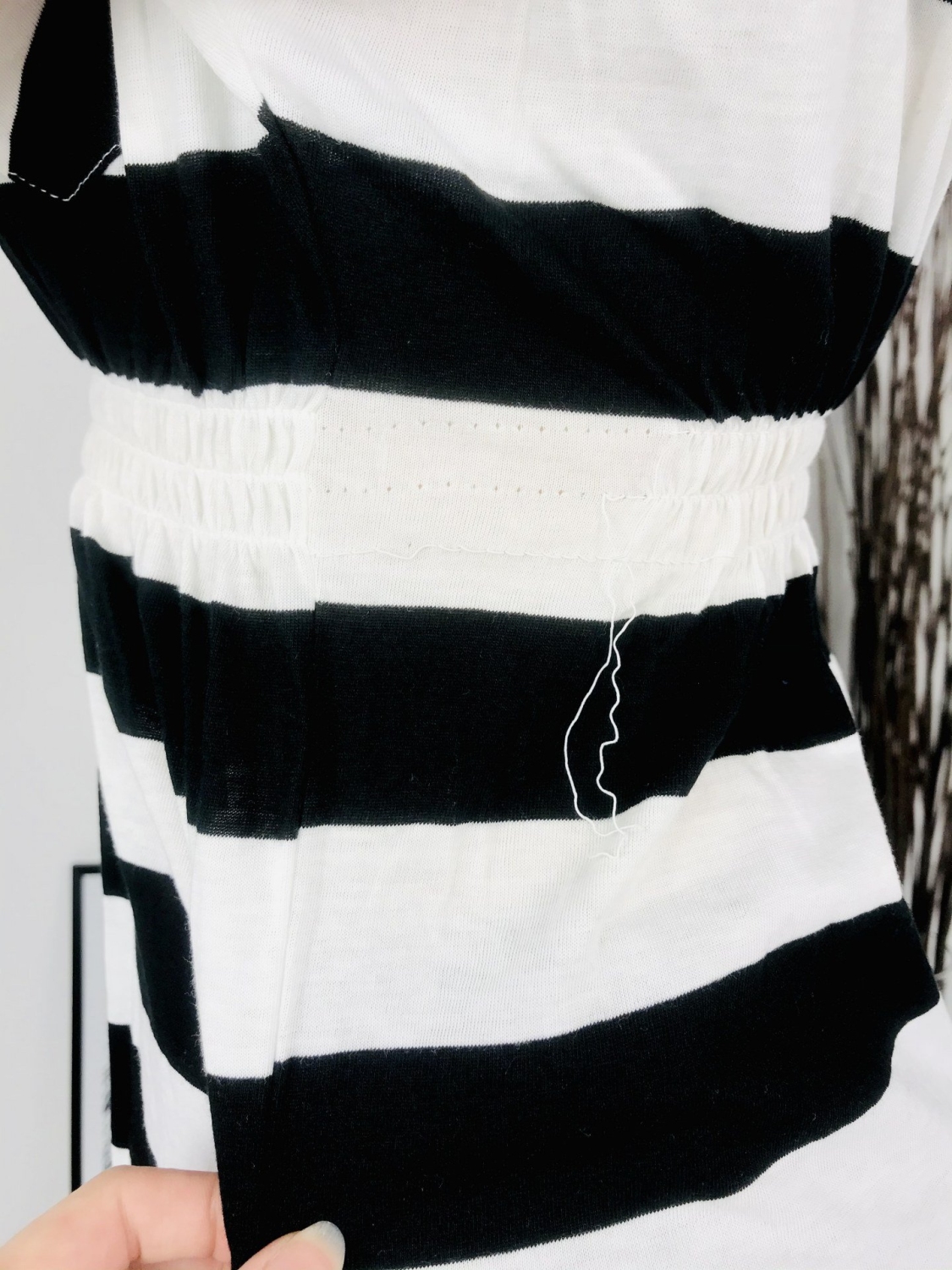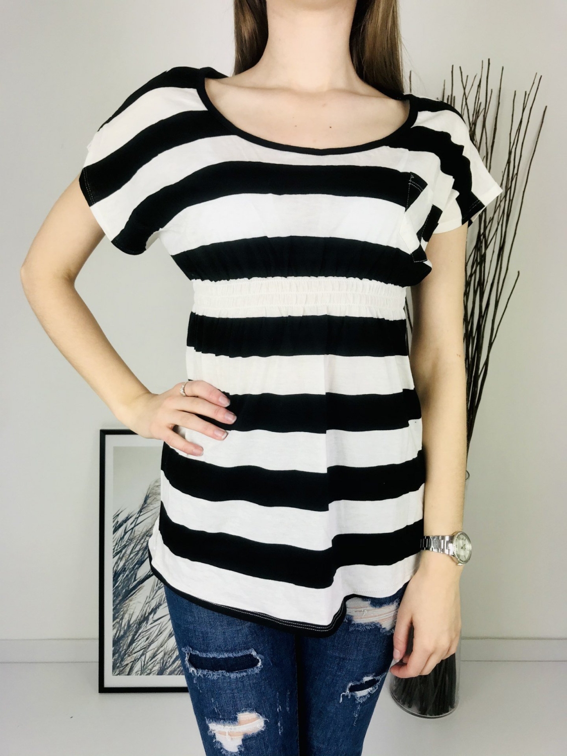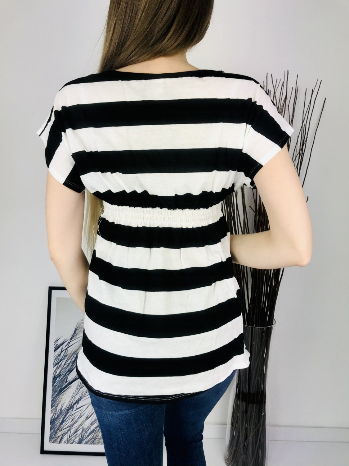 Dámske čierno-biele pruhované tričko s gumičkou v páse. Tričko je vhodné na bežné nosenie a jednoducho kombinovateľné. Príjemný letný materiál Vám zaručí pohodlie.
