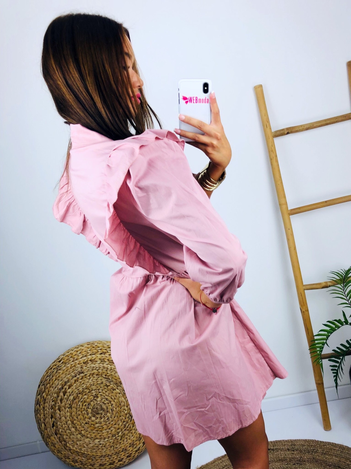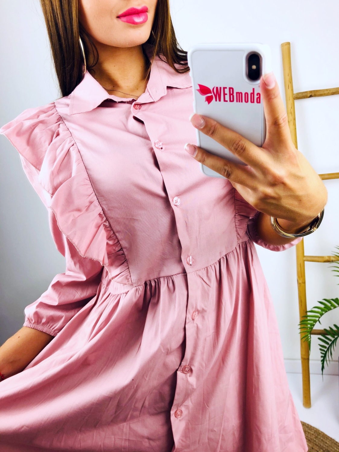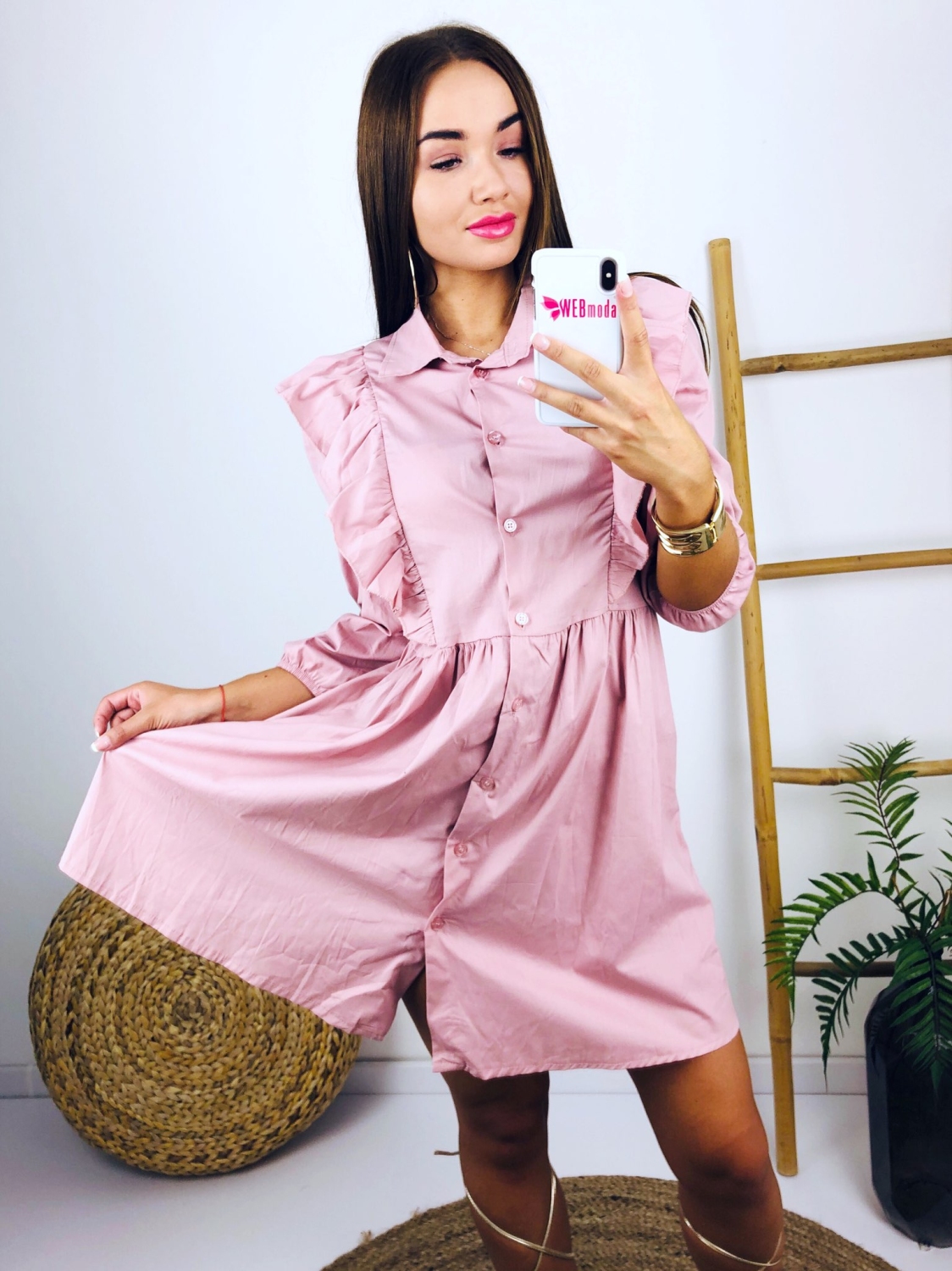 Tieto krátke ružové šaty si môžete obliecť takmer všade. Do mesta, práce, ale aj na večerné stretnutie. Príjemný padavý a kvalitný materiál je zárukou spokojnosti. Šaty majú trištvrťové rukávy a elegantný golierik. Zapínanie je na gombíky a sú zdobené volánikmi. Modelka je vysoká 173 cm a má oblečenú má veľkosť UNI.