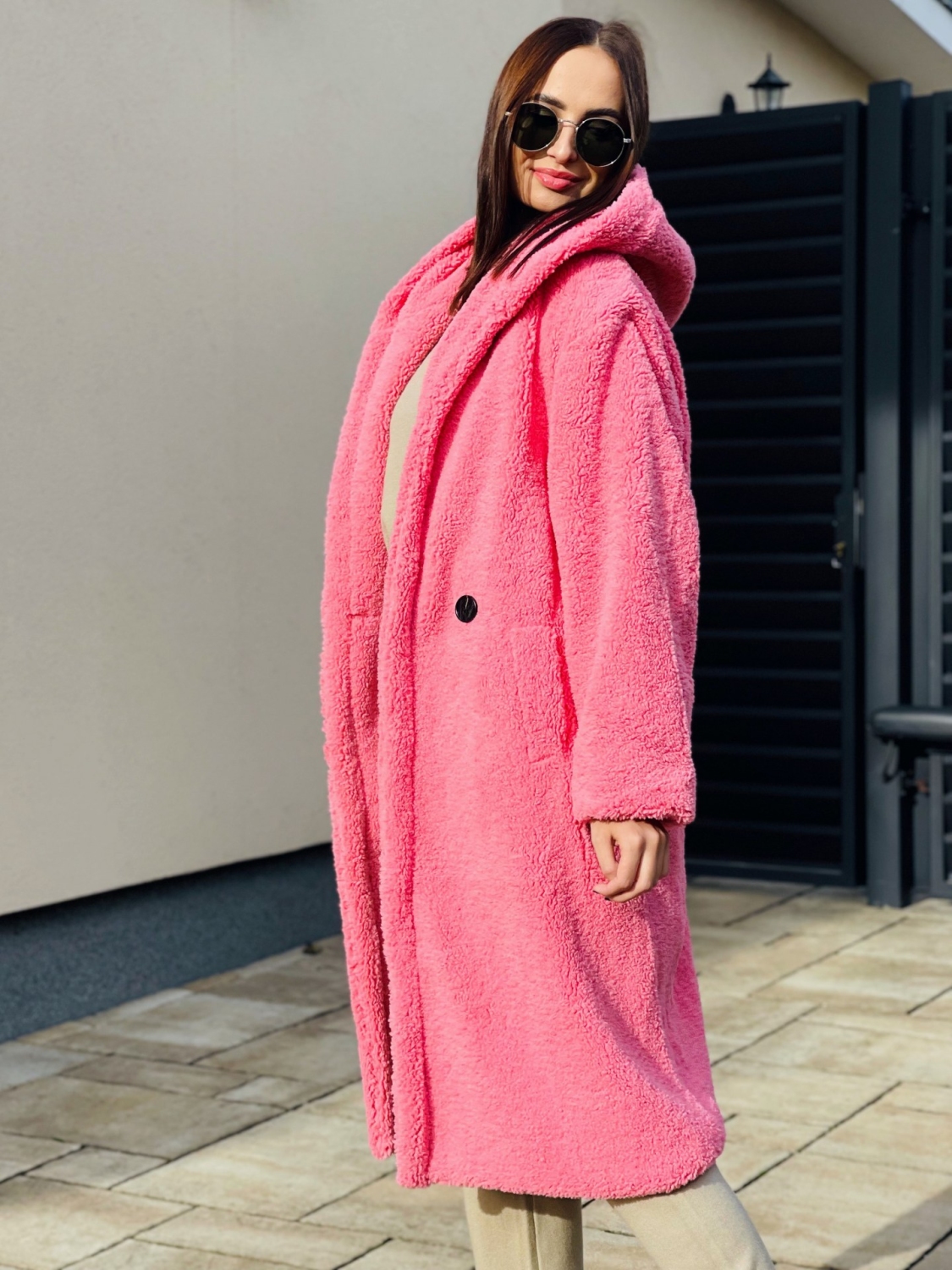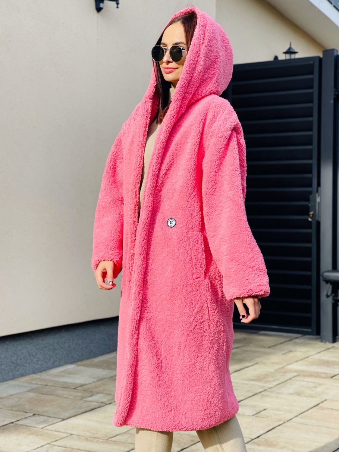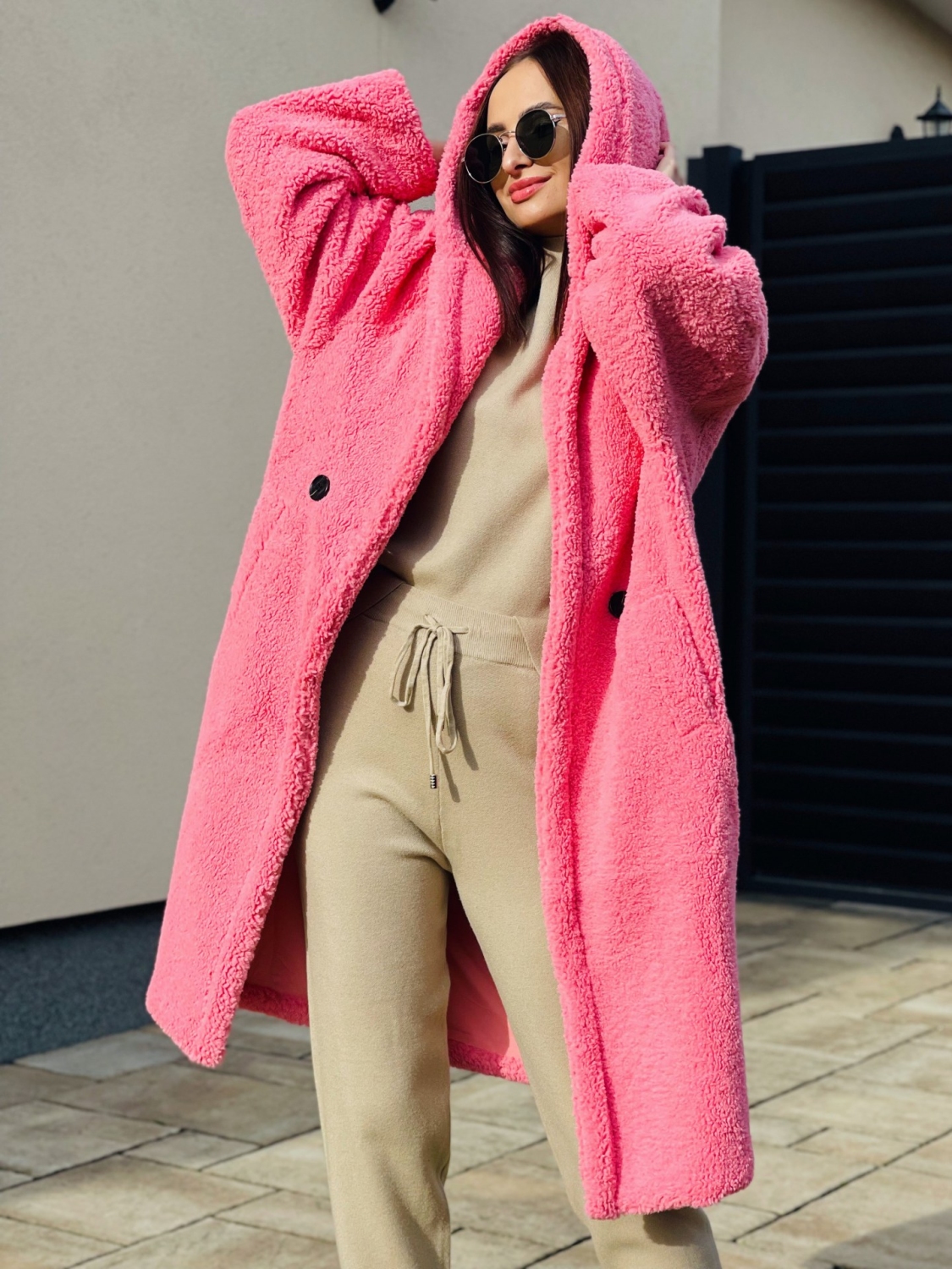Dámsky Teddy kabátik s kapucňou vhodný na jeseň aj zimu. Svojím oversize strihom pôsobí mohutne a extravagantne. Sľubujeme Vám, že pri ňom neostane žiadne oko bez povšimnutia. Jednoducho neprehliadnuteľný kúsok, ktorý by mala vlastniť každá módna maniačka. Kabát má dlhý rukáv a je v béžovej farbe. Dĺžka kabátu siaha pod kolená. Zapínanie na gombík vo svojej prednej časti. Vrecká na oboch stranách. Doplňte Váš šatník týmto štýlovým kúskom, ktorý jednoducho skombinujete a budete zaručene štýlová aj počas bežného dňa. Modelka je vysoká 175 cm a oblečenú má veľkosť M.