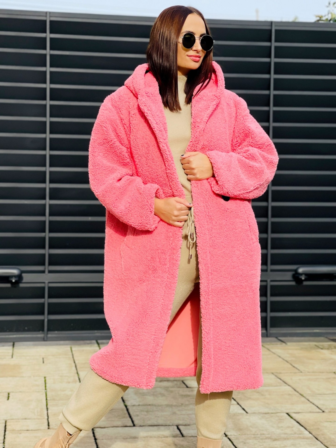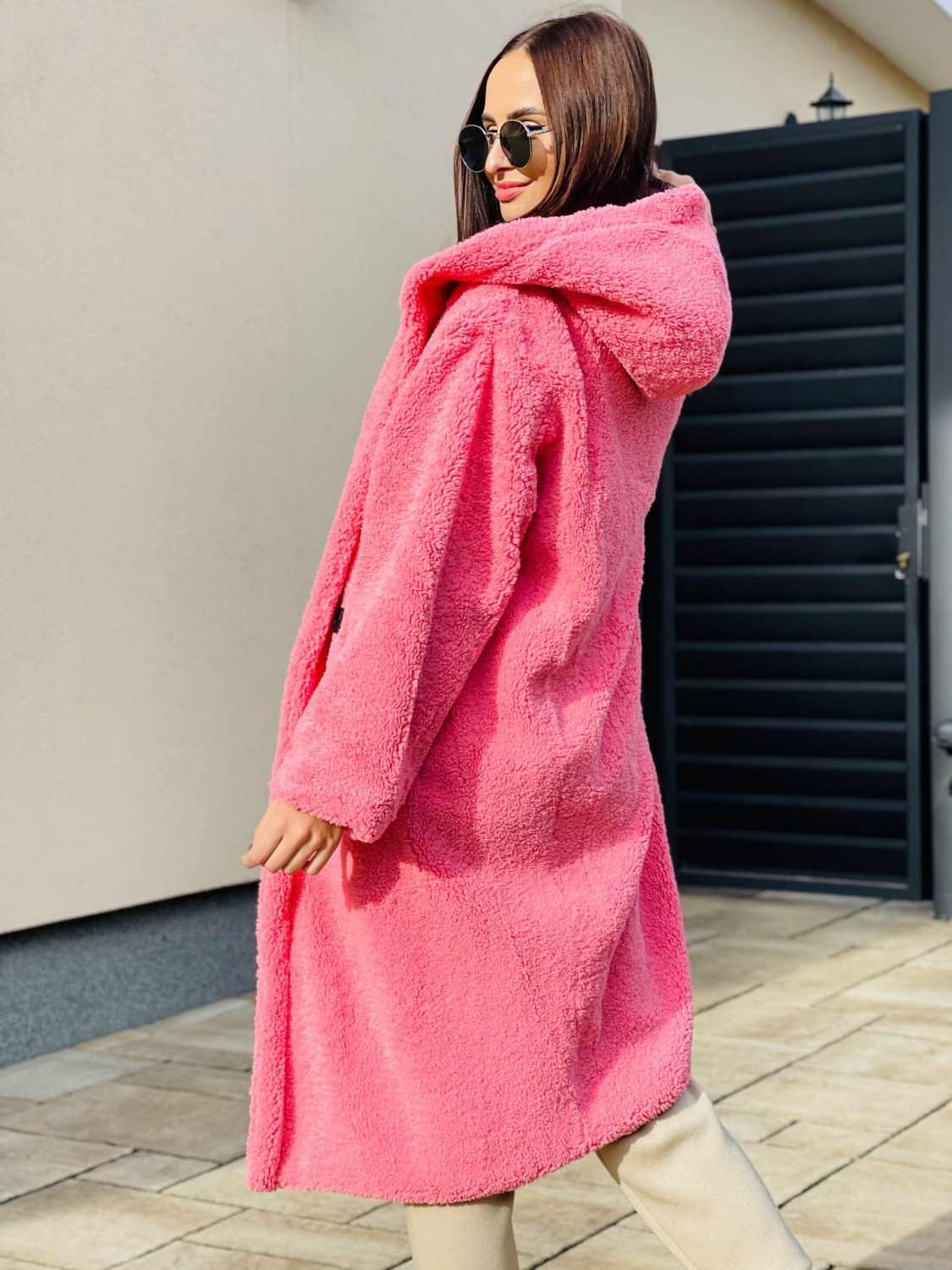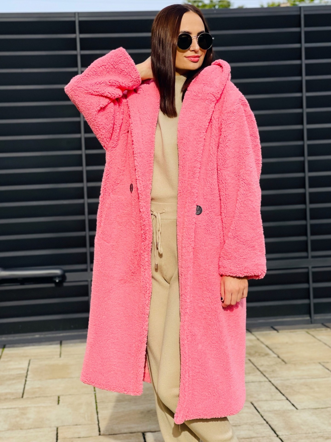 Dámsky Teddy kabátik s kapucňou vhodný na jeseň aj zimu. Svojím oversize strihom pôsobí mohutne a extravagantne. Sľubujeme Vám, že pri ňom neostane žiadne oko bez povšimnutia. Jednoducho neprehliadnuteľný kúsok, ktorý by mala vlastniť každá módna maniačka. Kabát má dlhý rukáv a je v béžovej farbe. Dĺžka kabátu siaha pod kolená. Zapínanie na gombík vo svojej prednej časti. Vrecká na oboch stranách. Doplňte Váš šatník týmto štýlovým kúskom, ktorý jednoducho skombinujete a budete zaručene štýlová aj počas bežného dňa. Modelka je vysoká 175 cm a oblečenú má veľkosť M.