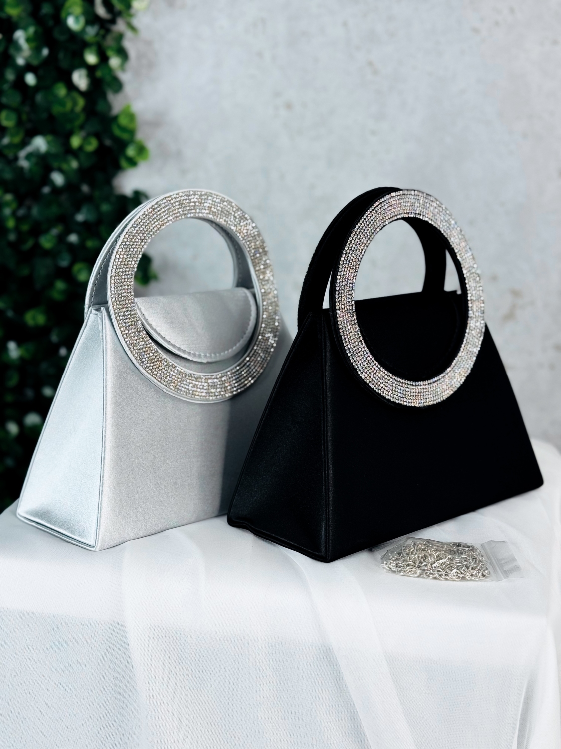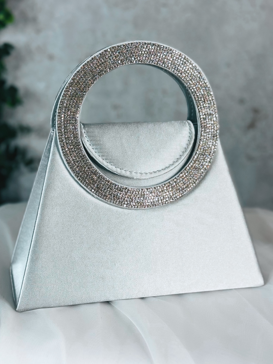 Táto elegantná dámska spoločenská kabelka predstavuje dokonalé spojenie luxusu, originality a nadčasovej elegancie. Vyrobená je z kvalitného saténového materiálu s jemným leskom, ktorý jej dodáva sofistikovaný vzhľad vhodný na večerné príležitosti, plesy či svadby. Dominantným prvkom kabelky je výrazné kruhové držadlo bohato zdobené drobnými krištáľovými kamienkami, ktoré nádherne odrážajú svetlo a pri každom pohybe vytvárajú žiarivý efekt. Tento detail pôsobí ako šperk sám o sebe a dodáva celému doplnku výnimočný charakter. Tvar kabelky je originálny a moderný – rozširuje sa smerom nadol do elegantného trojuholníkového profilu, čo jej dodáva stabilitu a vizuálnu zaujímavosť. Uzatváranie je diskrétne, prakticky riešené tak, aby nenarušovalo čisté línie dizajnu. Kabelka je ideálnou voľbou pre ženy, ktoré chcú vyniknúť svojím vkusom a citom pre detail.