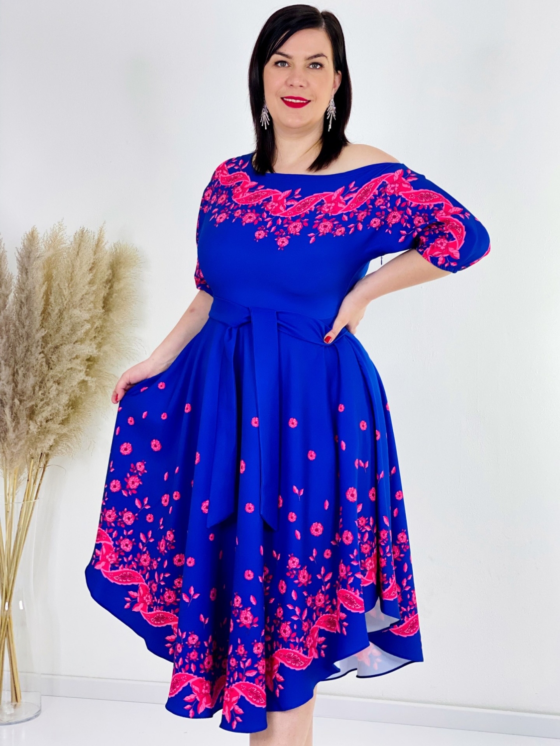 Spoločenské modro-ružové šaty s viazaním v páse a sukňou do A pre moletky, ktoré sú v zaujímavom letnom prevedení. Originálny a jedinečný strih, vhodné na viacero príležitosti. Módny kúsok pre moderné ženy. Materiál je príjemný, pohodlný, padavý a skvelo padne na postave. Doplňte váš šatník týmto trendy kúskom a zažiarte.