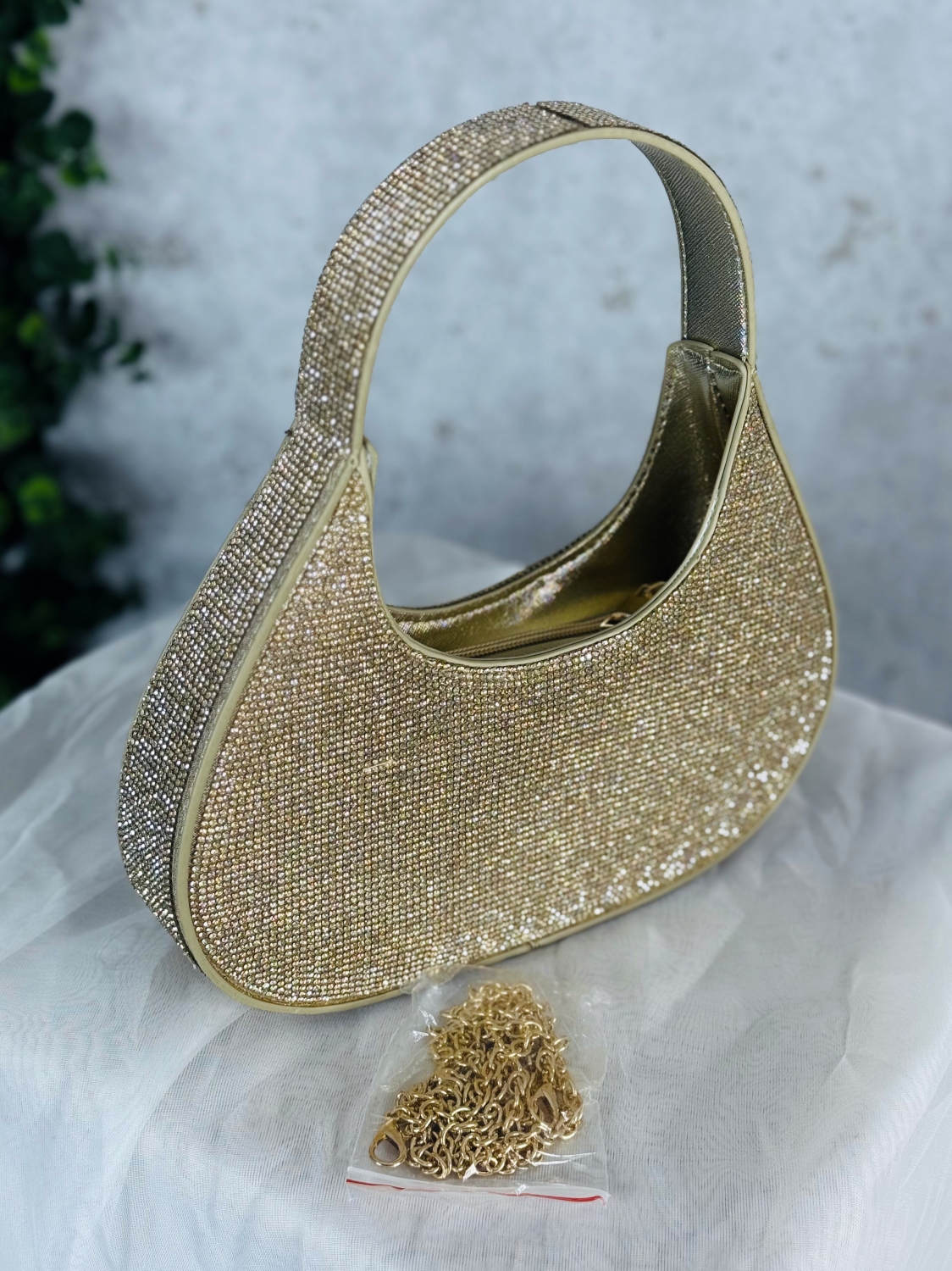 Predstavujeme kabelku, ktorá na seba strháva pozornosť ešte skôr, než stihnete vojsť do miestnosti. Táto kabelka je kúsok, ktorý okamžite dodá iskru každému outfitu – či už ide o elegantnú spoločenskú udalosť, výnimočný večer v meste alebo poriadnu párty, kde chcete zažiariť. Celý povrch kabelky je pokrytý jemnými trblietavými kamienkami, ktoré pri svetle vytvárajú nádherný „diamantový“ efekt. Oblý, moderný tvar pôsobí žensky a nadčasovo, zatiaľ čo pevná rúčka so zdobeným detailom dodáva kabelke luxusný a prémiový dojem. Napriek tomu, že vyzerá ako čistý šperk, je prekvapivo praktická – zmestia sa do nej všetky drobnosti, ktoré potrebujete mať pri sebe. Kombinuje eleganciu spoločenských modelov s hravosťou party štýlu, takže je ideálnou voľbou pre ženy, ktoré chcú jeden doplnok na všetko: svadby, plesy, večierky, párty aj bežné večerné outfity, kde chcete jednoducho zažiariť.
