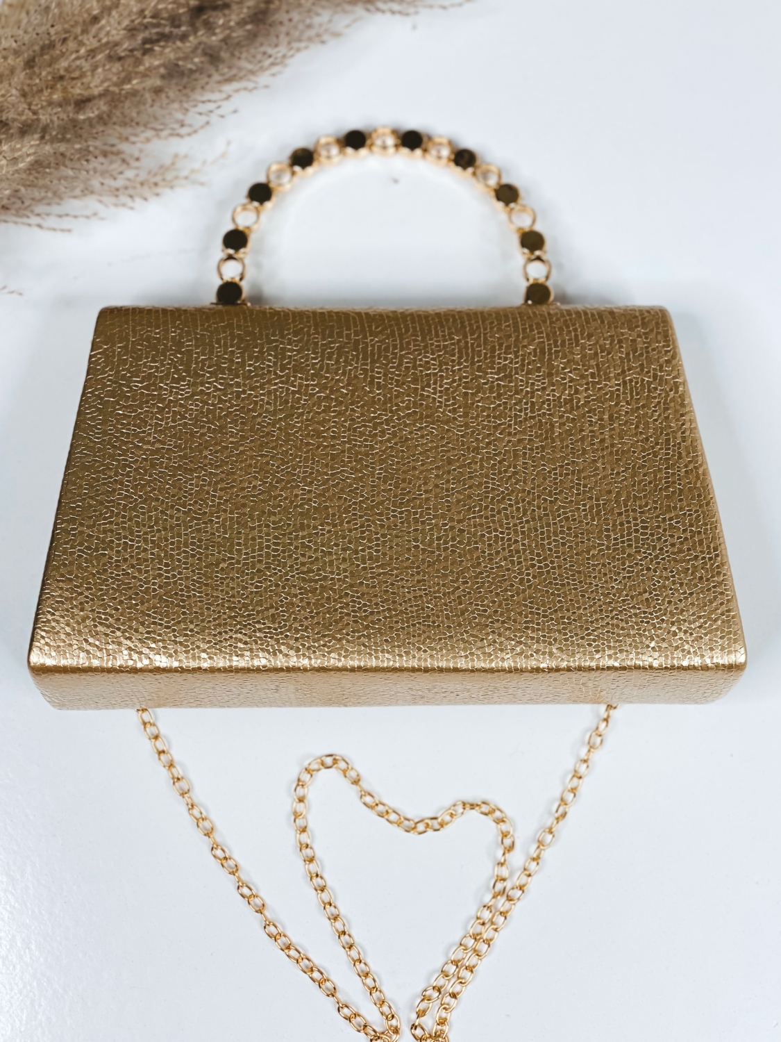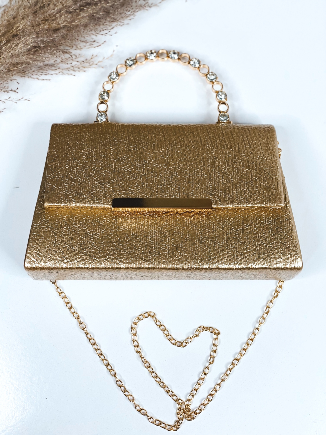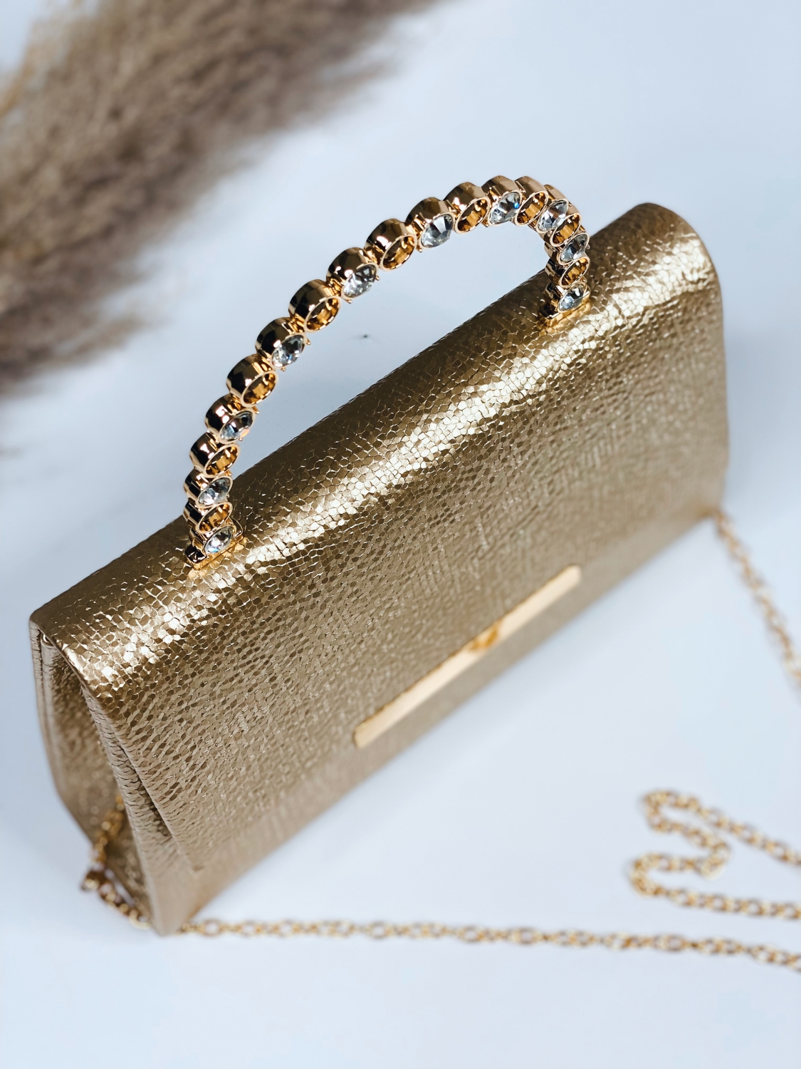 Táto luxusná spoločenská kabelka je dokonalým doplnkom pre každú špeciálnu príležitosť. Zaujme už na prvý pohľad svojím elegantným dizajnom a jemným leskom, ktorý pôsobí sofistikovane a žensky. Originálne zdobená rúčka s výraznými kamienkami dodáva kabelke nádych luxusu a robí z nej neprehliadnuteľný kúsok. Každý detail je premyslený tak, aby podčiarkol výnimočnosť tohto doplnku – od pevnej štruktúry, ktorá drží tvar, až po kvalitné kovové doplnky a precízne spracovanie. Retiazkový remienok umožňuje pohodlné nosenie na ramene alebo cez telo, no rovnako skvelo vynikne aj v ruke ako elegantné psaníčko. Vnútro kabelky ponúka dostatok priestoru na vaše drobnosti – mobil, rúž, kľúče či malú peňaženku – takže budete mať všetko potrebné po ruke, bez toho, aby ste sa museli vzdať štýlu.