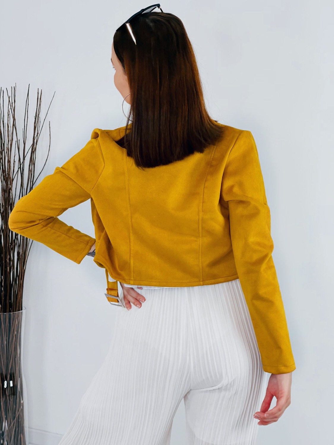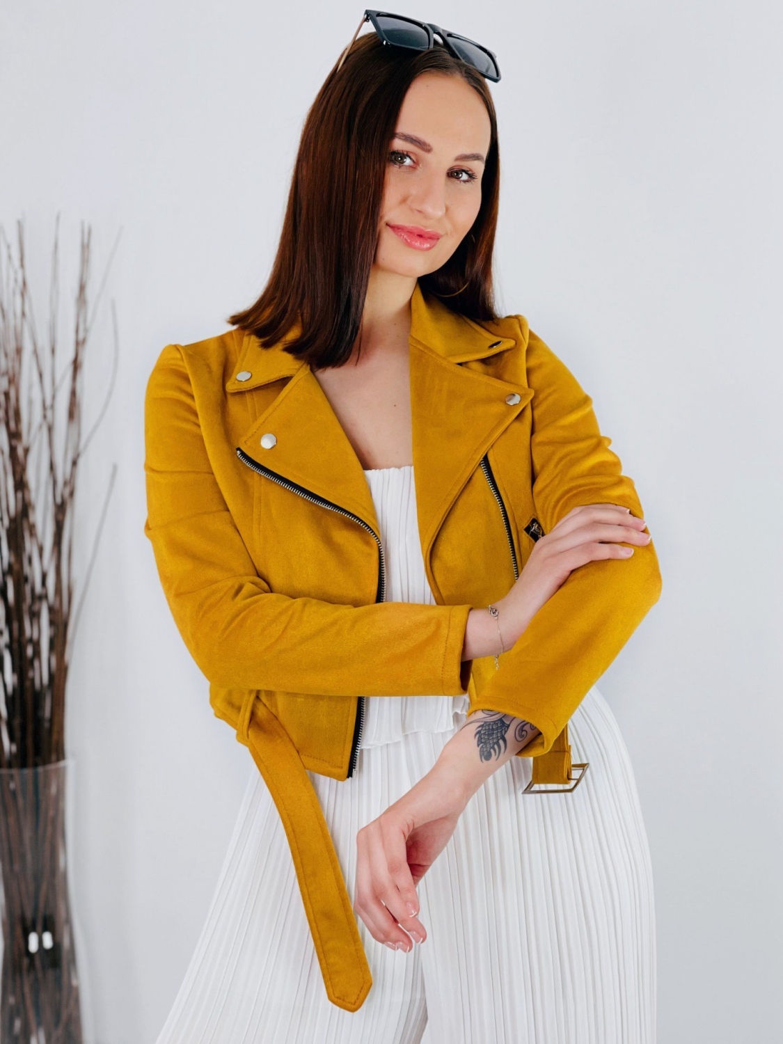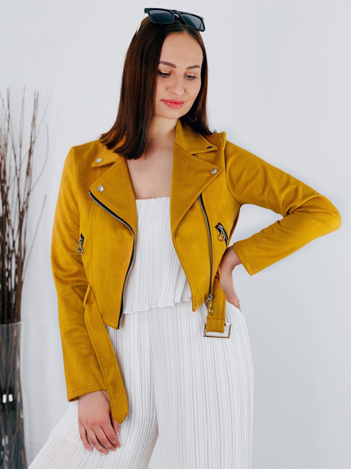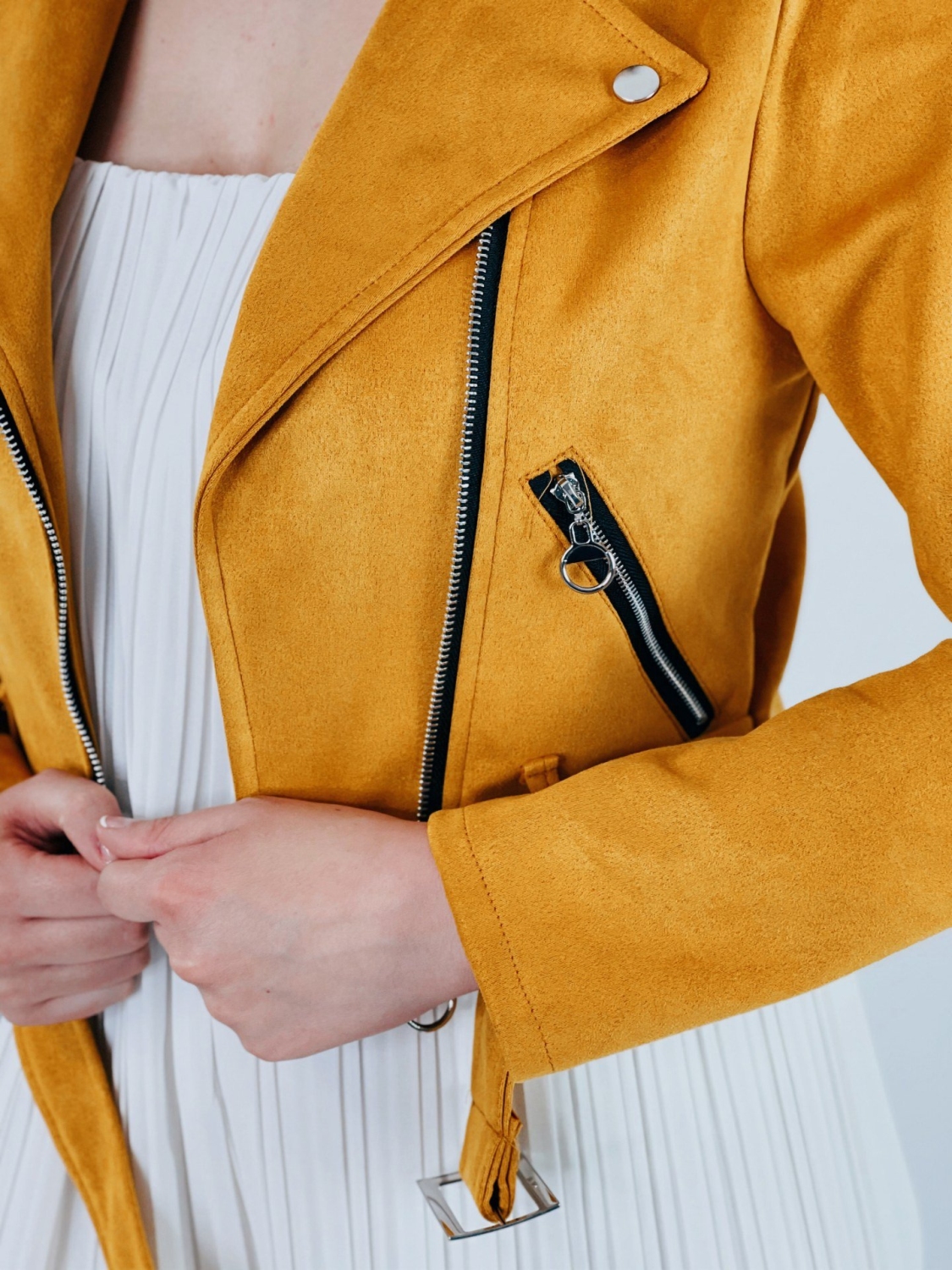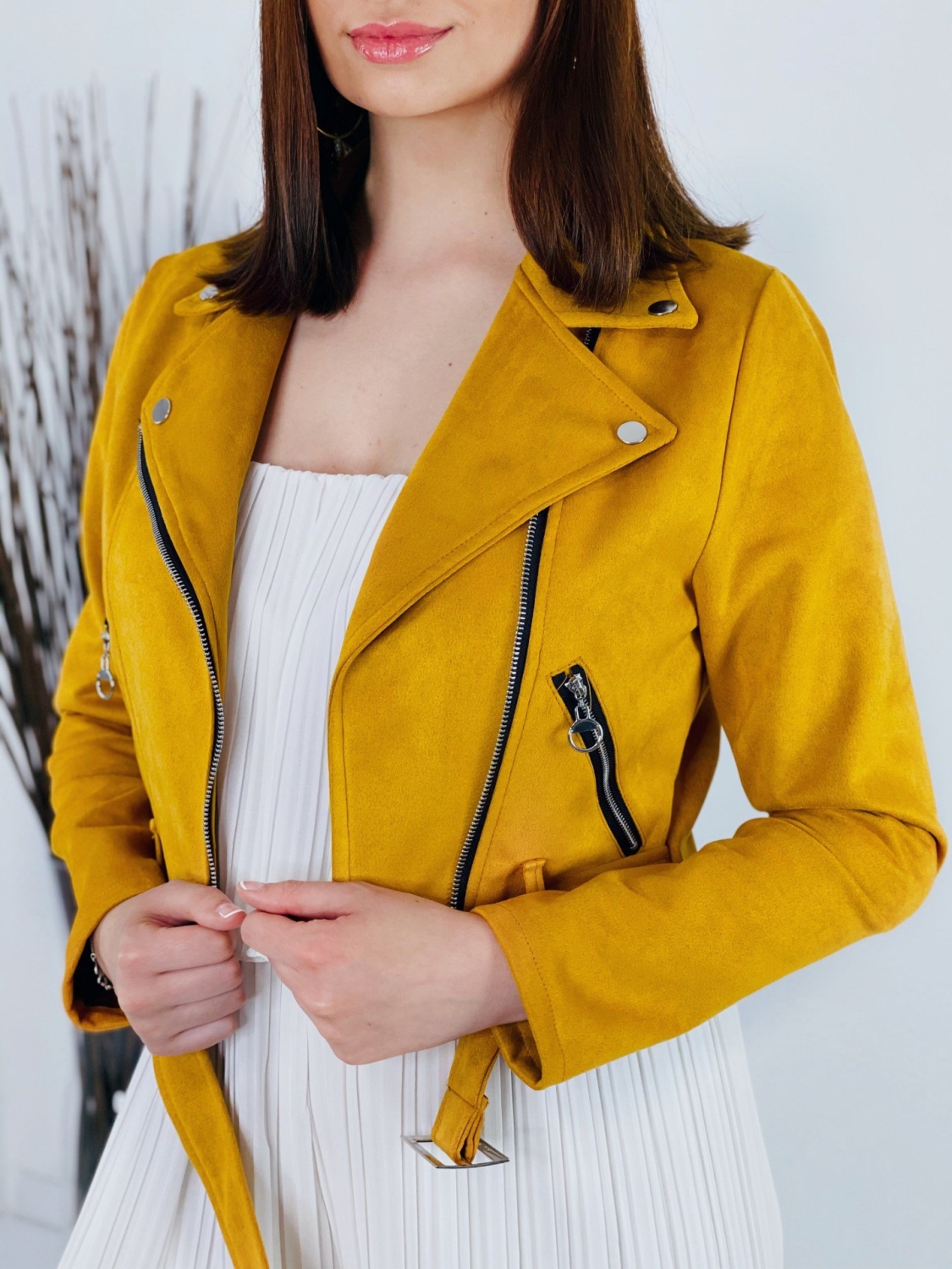 Dámska žltá semišová koženka do pása s opaskom z príjemného elastického materiálu. Univerzálny kúsok, ktorý sa hodí k rifliam, ale aj šatám. Bunda je na zapínanie na zips. Perfektne prispôsobí a zahreje v prechodnom počasí. Bunda, ktorá je stále top módnym hitom.